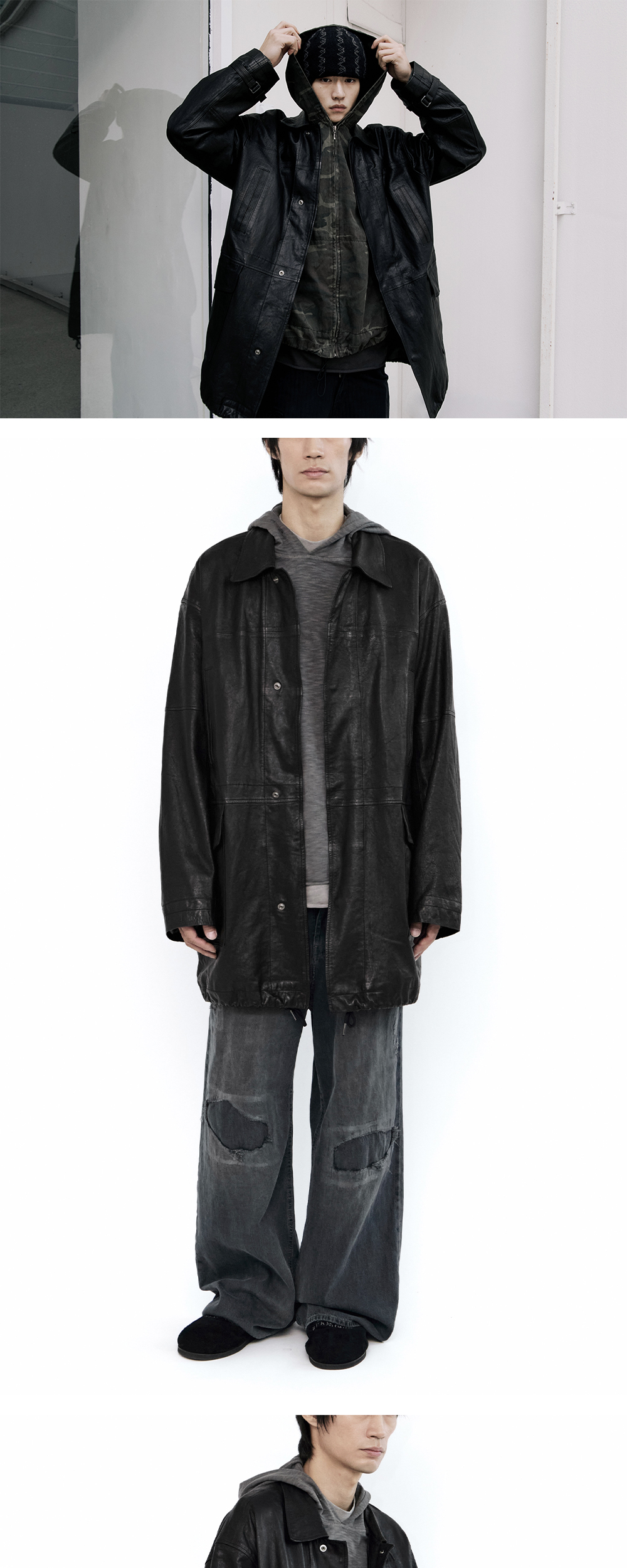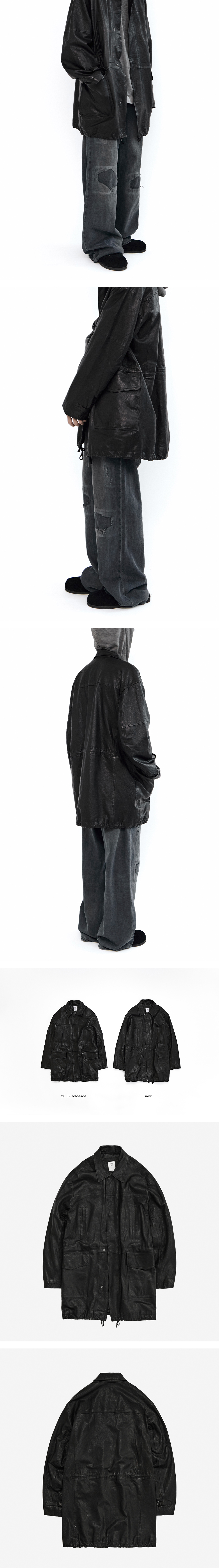 lamb skin leather car coat - 중기장 카코트 베이스로 디자인 - 베지터블 워시 적용된 램스킨으로 제작 - 워싱을 통해 구현한 특유의 힘있는 질감 - 적당히 여유감 있는 실루엣 - 밑단을 가볍게 조여 착용 시 제작자가 의도한 실루엣으로 착용 가능합니다. *모델: 170 중반 / 마른 체형, 3사이즈 착용 *디자인 의도에 맞게 착용하시려면 기존 폴리테루 제품과 동일한 사이즈를 선택하시는 것을 권장드립니다. *일반 체형 기준 - 170cm 초반 이하 2사이즈 권장 - 170cm 중반 3사이즈 권장 - 170cm 후반~180cm 초반 4사이즈 권장 *직전 대비 더 부드러운 소재로 제작되어, 착용감 및 드레이프성이 좋아지나, 두께 및 중량감은 조금 더 라이트한 쪽으로 변동되었습니다. *본 제품은 직전 차수와 유사한 실측 및 착용감으로 제작되었습니다. 정확한 상세 사이즈의 경우, 실측표 확인 부탁드립니다.