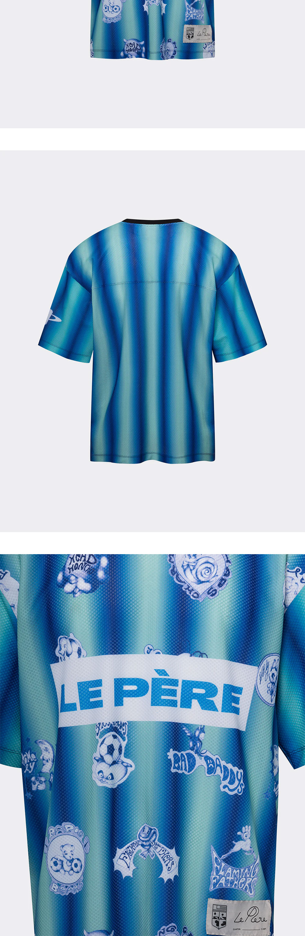 - 프리미엄 이탈리아 메쉬로 제작된 박시핏 축구 저지 - 앞면의 'LE PERE' 로고와 왜곡된 스트라이프 - Ema Gaspar의 다양한 클럽 크레스트 일러스트 - 밑단에 있는 스포츠 프로방스와 백 요크가 특징적인 제품 A model is 185 cm and wearing a size M.