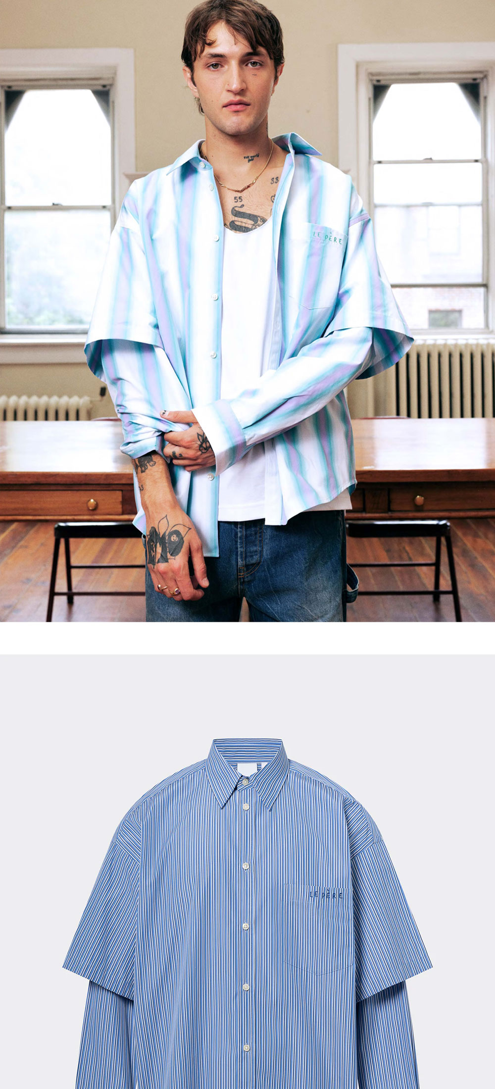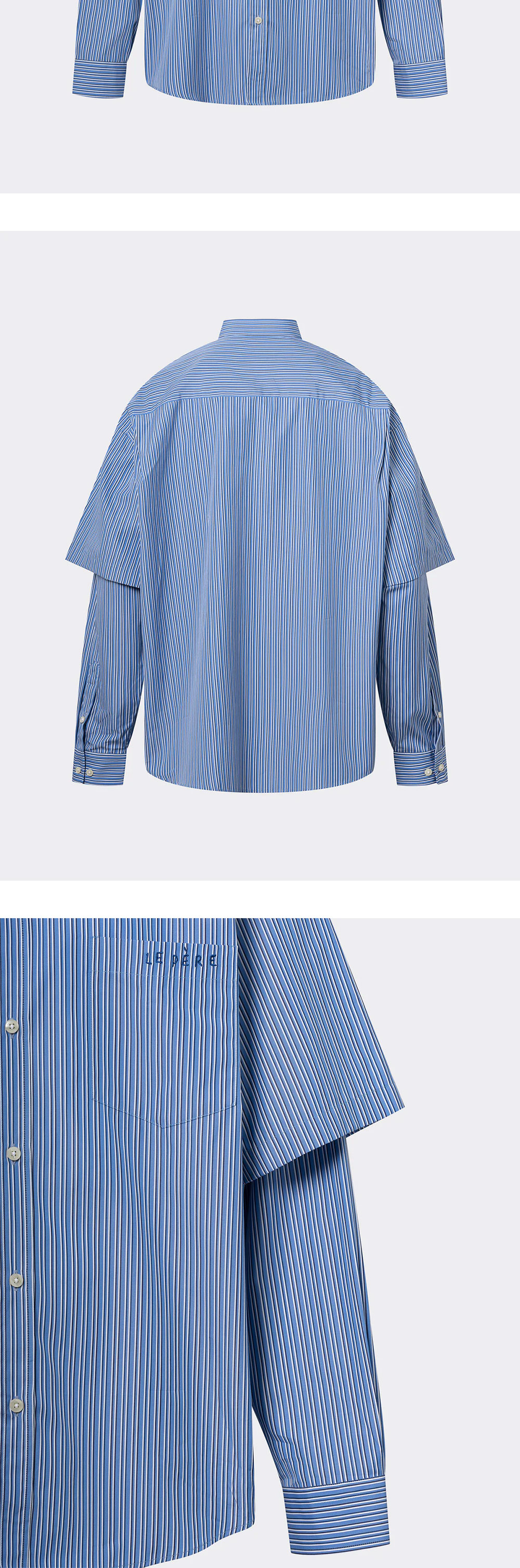 - 더블 레이어드의 오버사이즈 셔츠 - 더블 백 플리츠 - 가슴 포켓의 "le PÈRE" 자수 로고 A model is 185cm and wearing a size M. *상세 이미지 내 모델이 착용한 상품의 경우, 동일한 상품의 타 컬러인 점 참고 부탁드립니다.