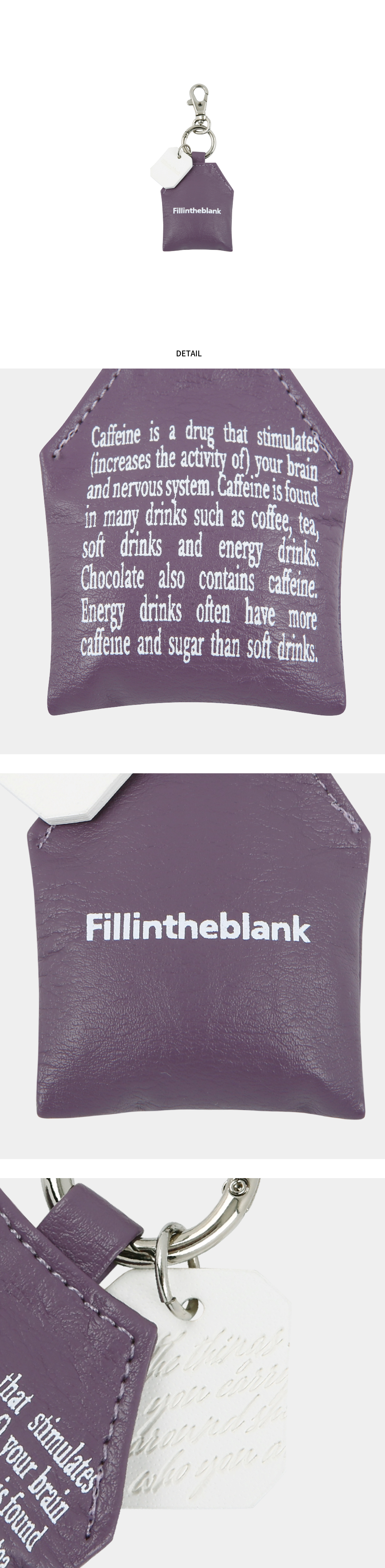 쿠션감이 느껴지는 티백 모티프 디자인과 독특한 드립백 패키징이 특징인, 필인더블랭크만의 메시지를 담은 레더 라벨을 믹스해 오브제로도 활용 가능한 레더 키링이다.
