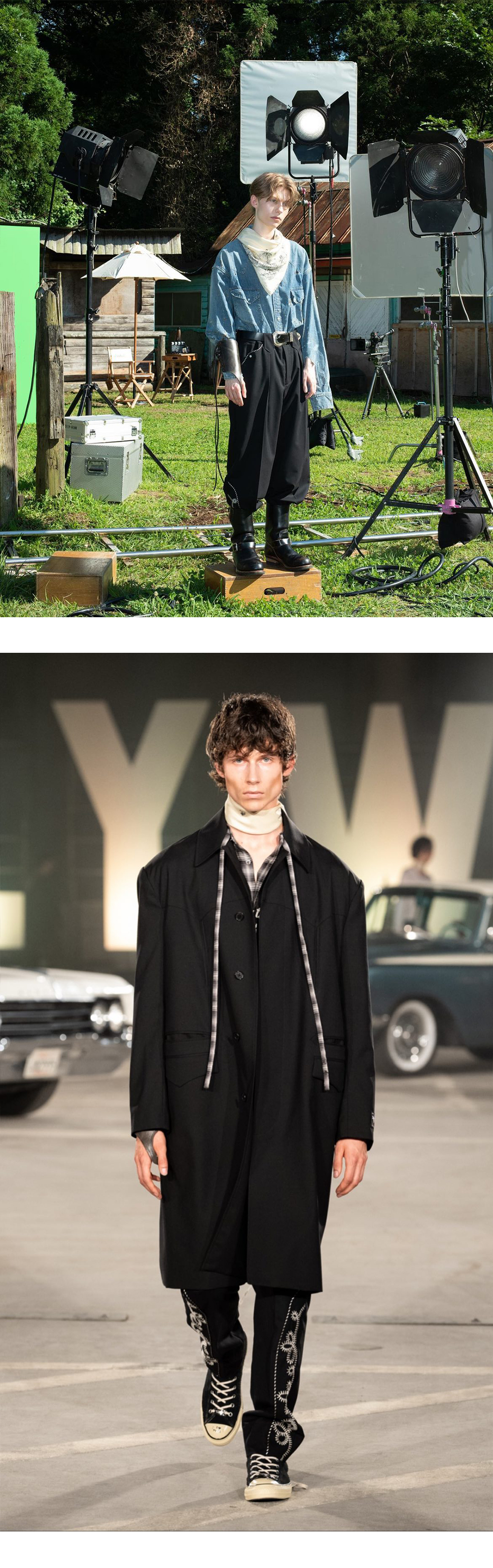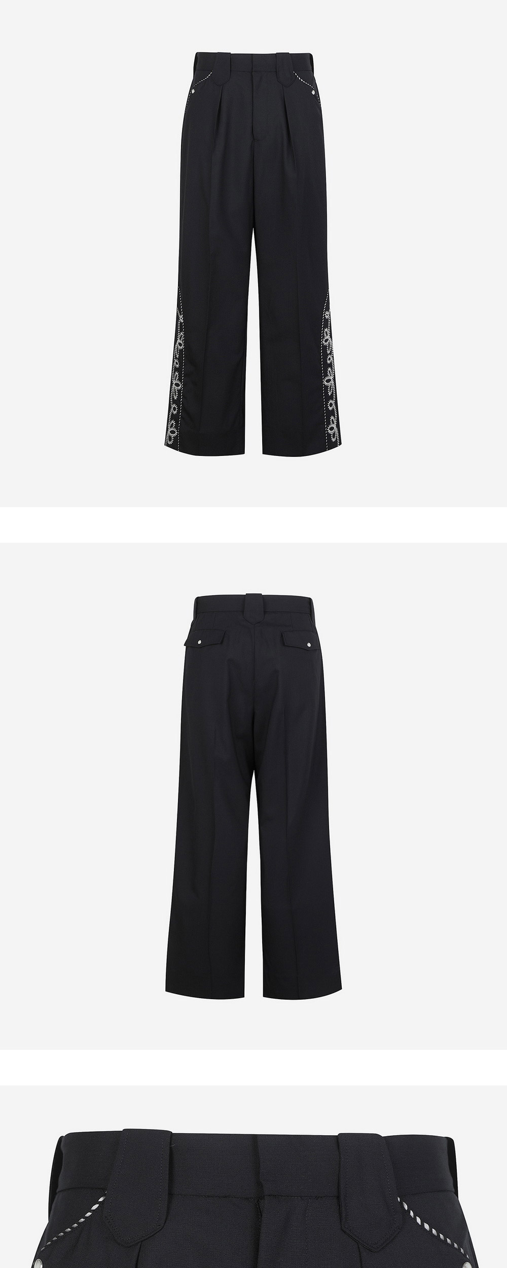 다이리쿠의 웨스턴 스타일에서 영감을 받은 24SS 와이드 슬랙스입니다. - 사이드에 들어간 웨스턴 무드의 자수 - 전면 다트 디테일 - 사이드 포켓 라인의 점선 자수 디테일 - 와이드 핏 - 울 소재로 부드럽고 편안한 착용감