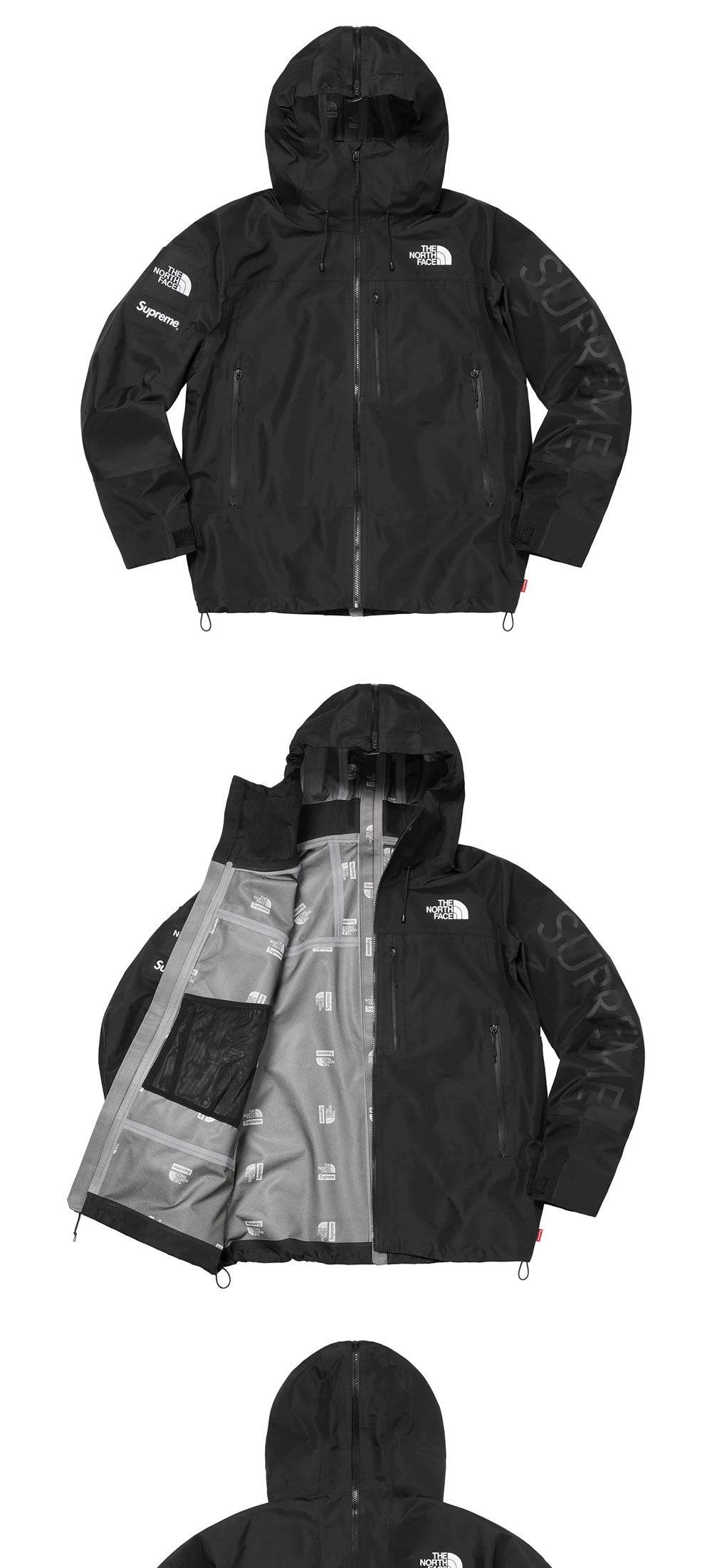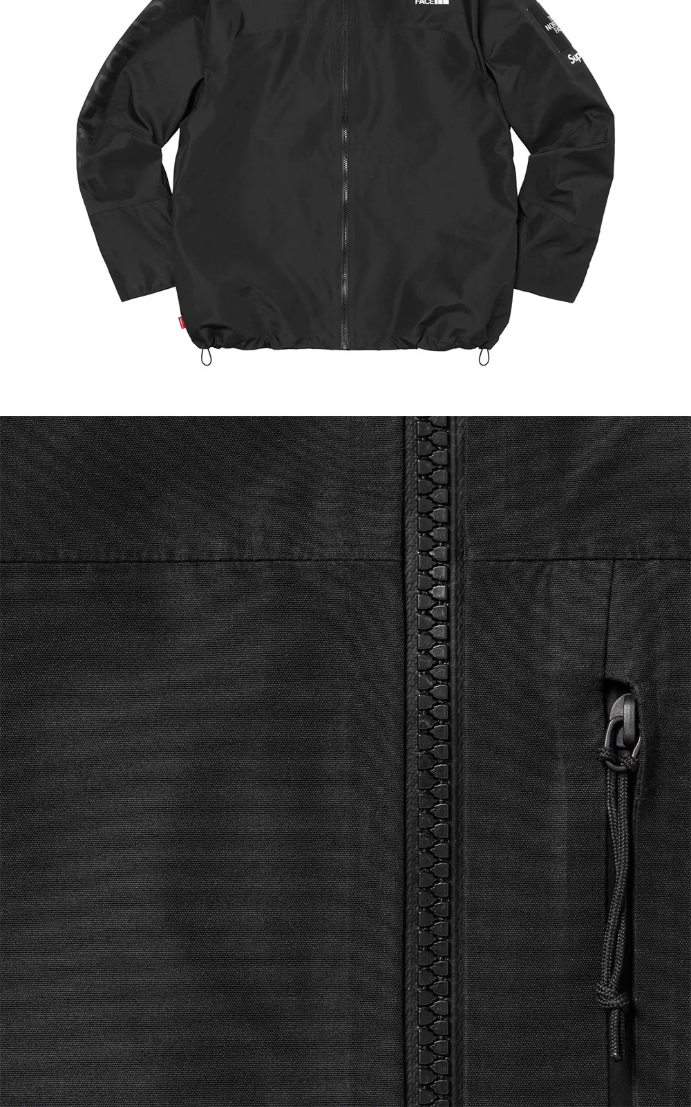 - Three-layer poly shell with fully sealed seams and printed logo tricot backing - Full zip closure at front, hood and back. Zip pockets at front and chest with interior pouch pocket - Interior elastic shockcord at fixed hood and hem with velcro tab adjusters at cuffs - High density printed logos on chest, back shoulder and sleeve - Logo patches on sleeve - Made exclusively for Supreme