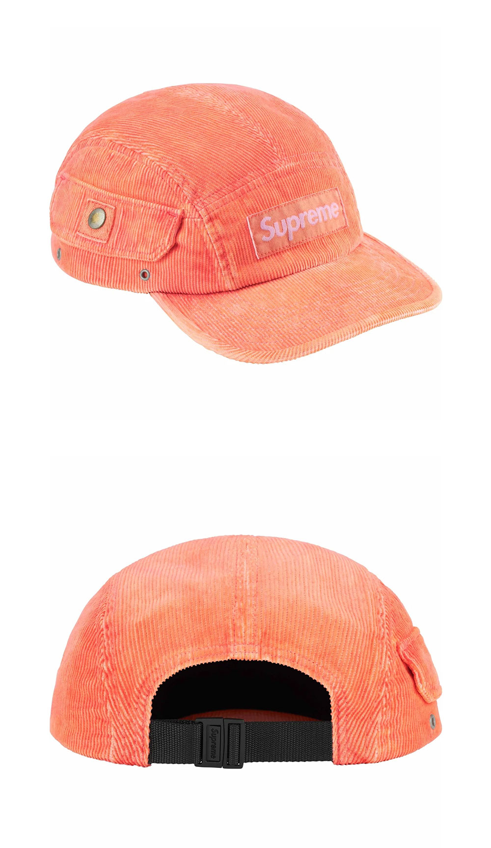 - All cotton corduroy Supreme camp cap with snap flap pocket at side