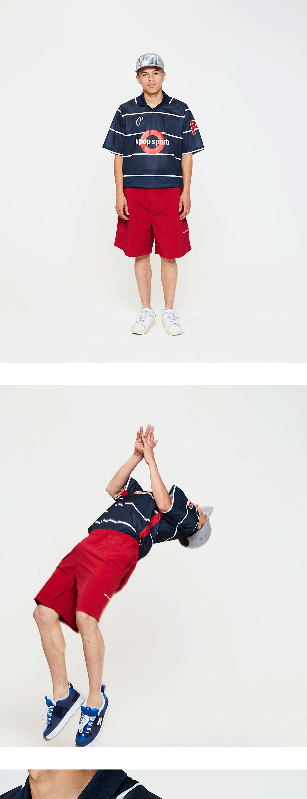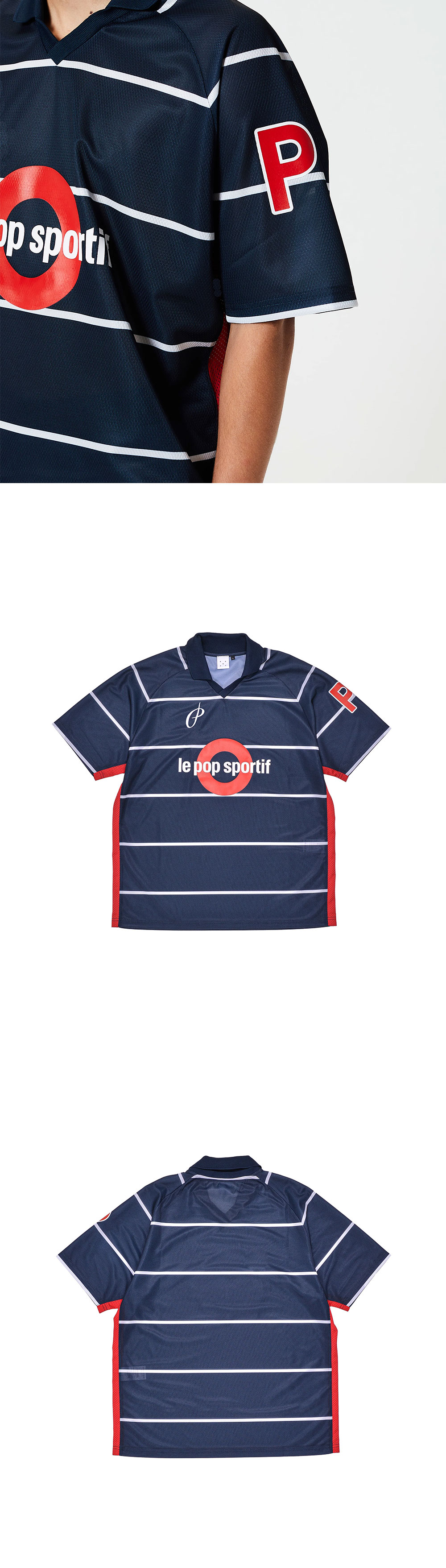 - 래글런 소매 & 골지 칼라와 오버레이가 있는 브이 네크라인 - 앞면에 자수 - 앞면과 왼쪽 소매에 plastisol pop sportif 아트웍 인쇄 - 옆선에 레드 메쉬 패널 - 뒷목 부분에 반달 스티치 - 뒷목 부분에 오프 화이트 자수 로고 - 스트라이프 패턴