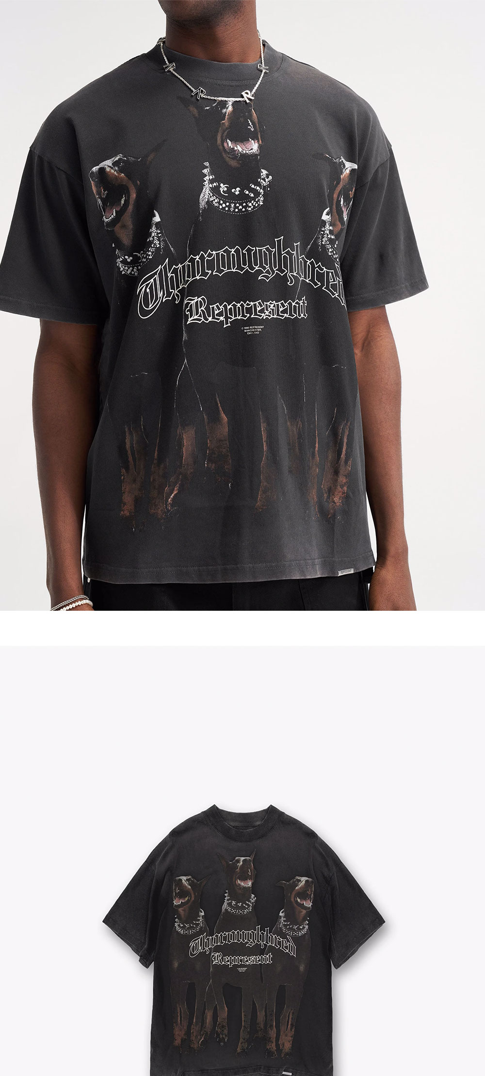 중간 무게감의 저지 면으로 제작된 오버사이즈 핏의 티셔츠를 소개합니다. 립 크루넥 칼라와 가슴과 후면의 Thoroughbred 프린트, 그리고 밑단의 Represent 로고 메탈 바가 특징입니다.