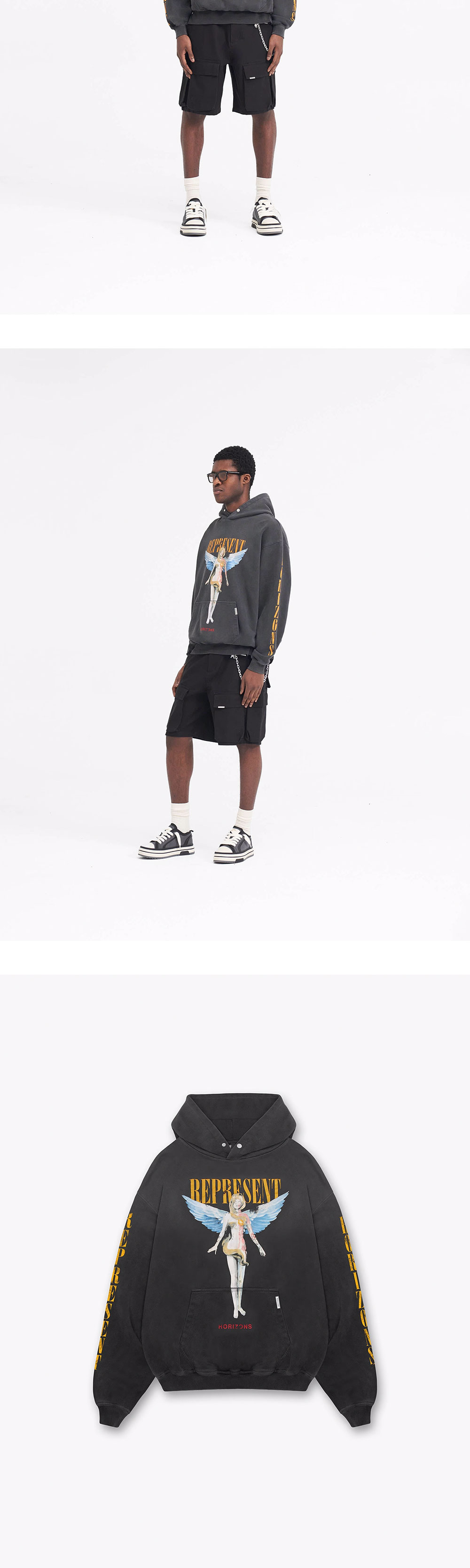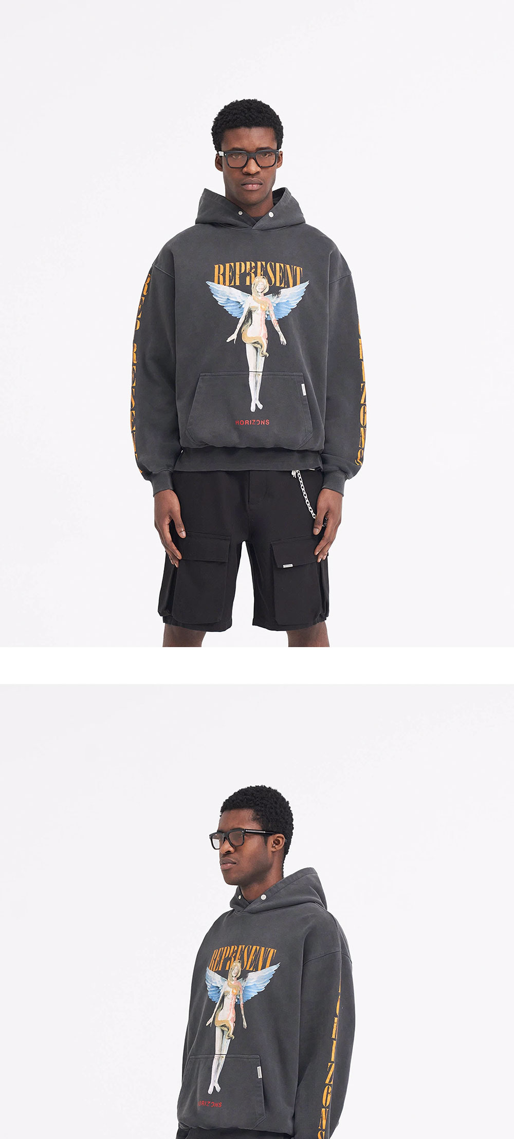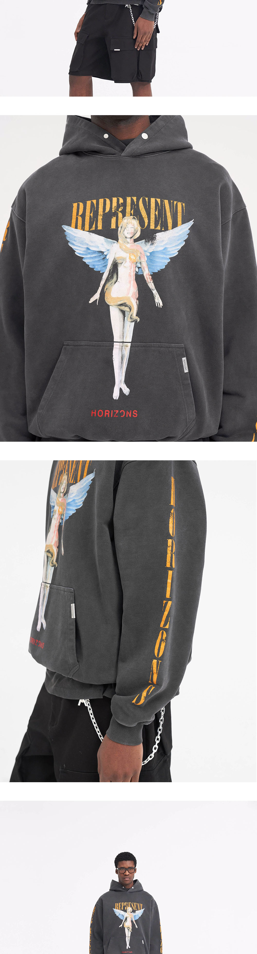 오버사이즈 핏의 후디를 소개합니다. 밑단과 커프스는 립으로 마무리되어 있으며 포켓에는 Represent 로고 메탈 바가, 후드에는 똑딱이가 달려 있습니다. 앞면의 빈티지 Reborn 그래픽 각 소매의 Horizons & Represent 그래픽이 포인트입니다. * 모델 신체 스펙: 182cm, 73kg / 착용 사이즈: M