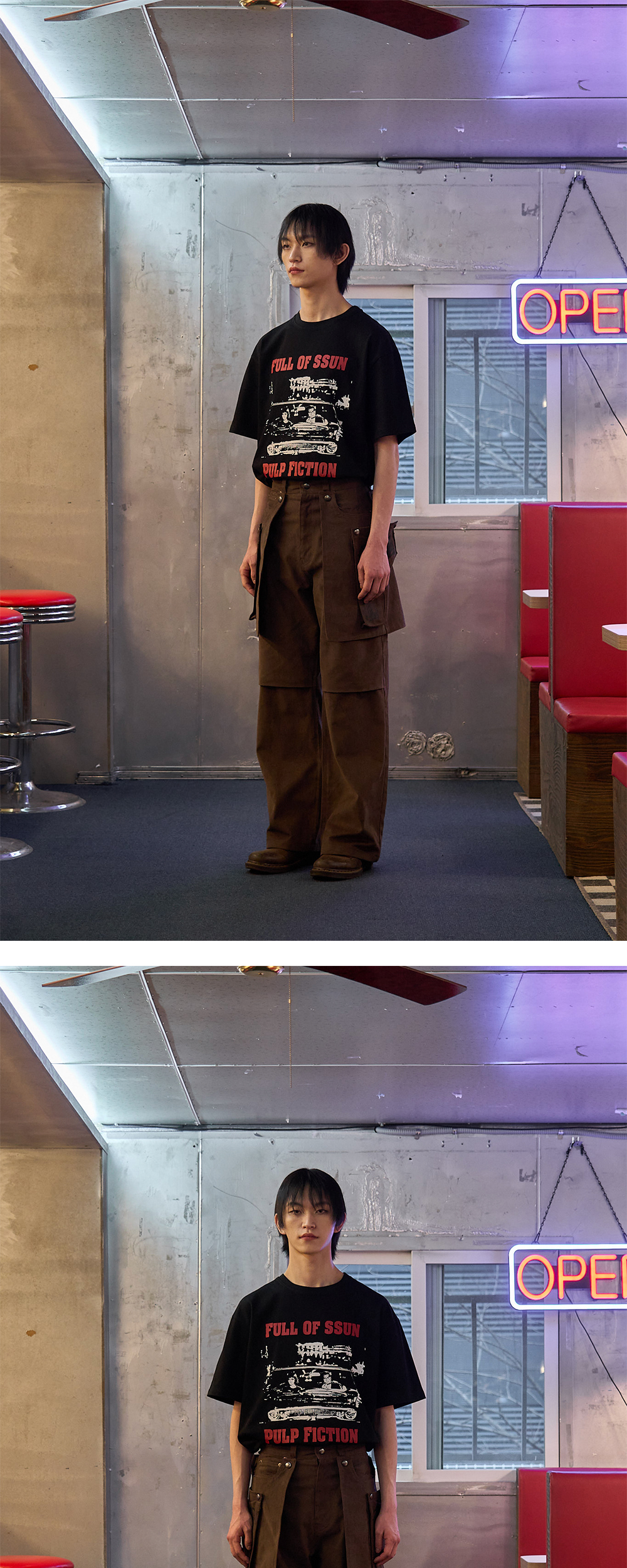 - 영화 '펄프픽션'에서 주인공 미아와 빈센트의 드라이브 씬을 복각한 나염 프린팅 티셔츠