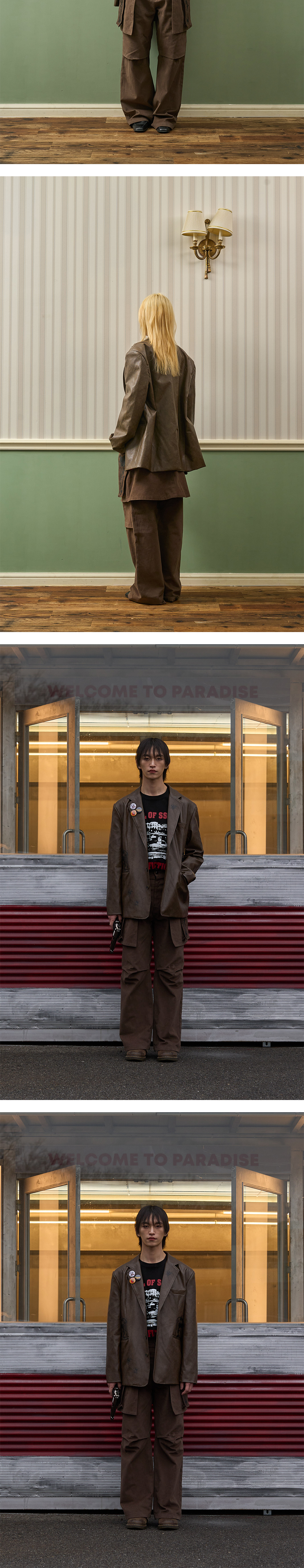 - 해당 상품은 주문 제작 상품으로 영업일 기준 5~7 일 이후 출고됩니다. - 제품 색상은 모델컷이 아닌 제품컷의 색상이 실제 색상과 더 가깝습니다. - 빈티지한 느낌의 레더 블레이져 자켓 - 총 나염프린팅 디테일
