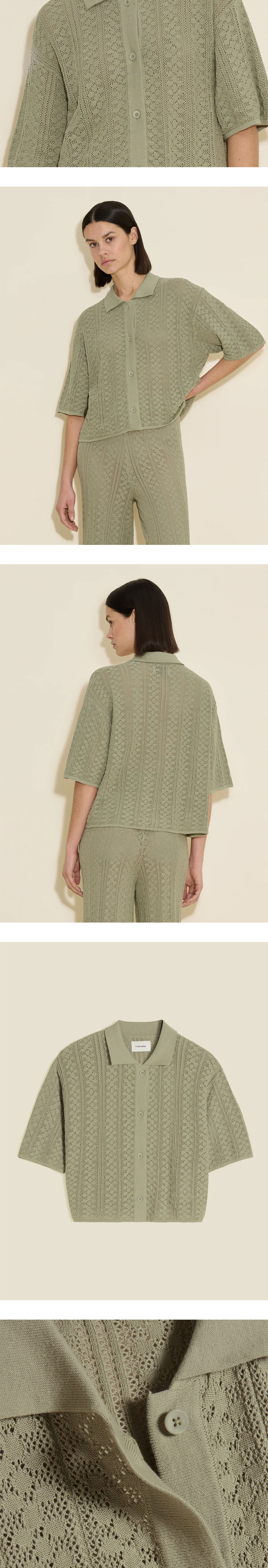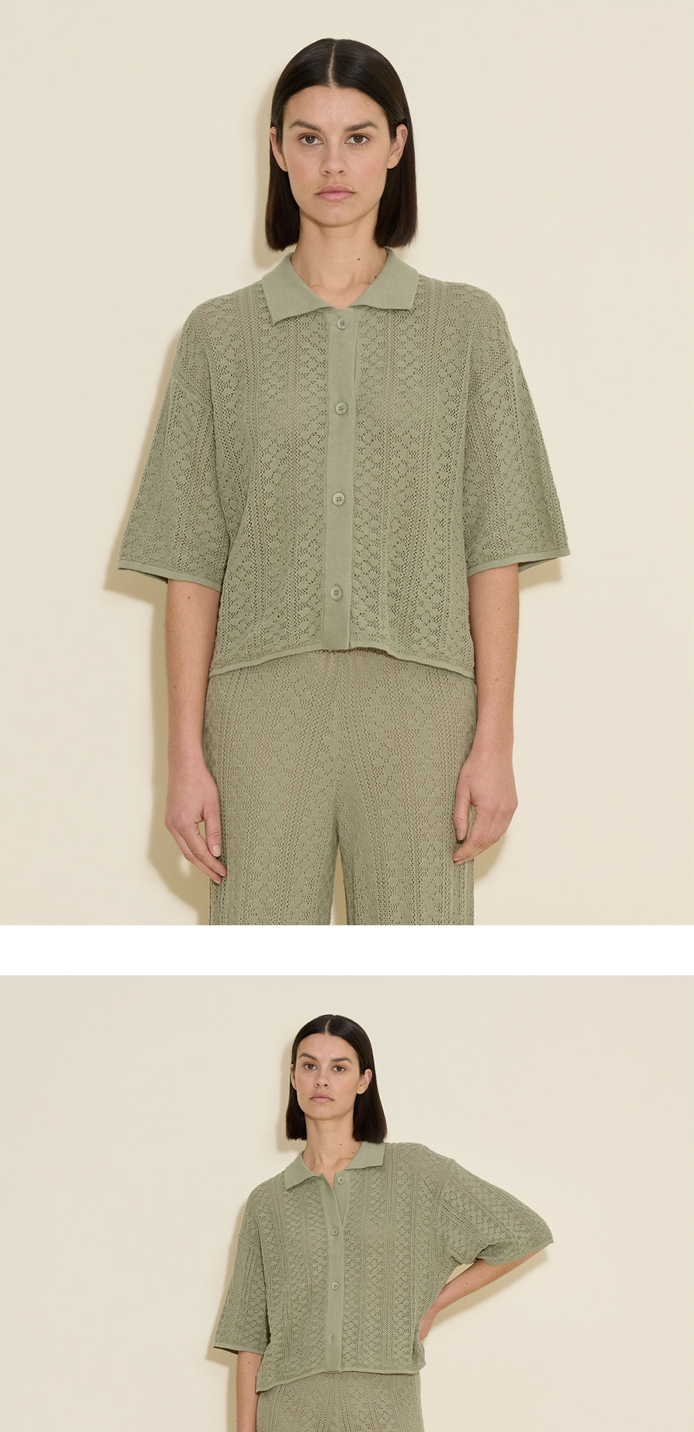 로크 크로셰 니트 셔츠는 순면 소재로 제작되어 부드러운 착용감을 주는 니트 셔츠입니다. 약간의 크롭한 실루엣과 넓은 숏슬리브 디자인이 특징적입니다. - 릴랙스드 핏 - 크롭한 길이 - 숏슬리브 - 앞면의 단추 여밈 * 모델은 175cm이며 XS 사이즈를 착용하였습니다.