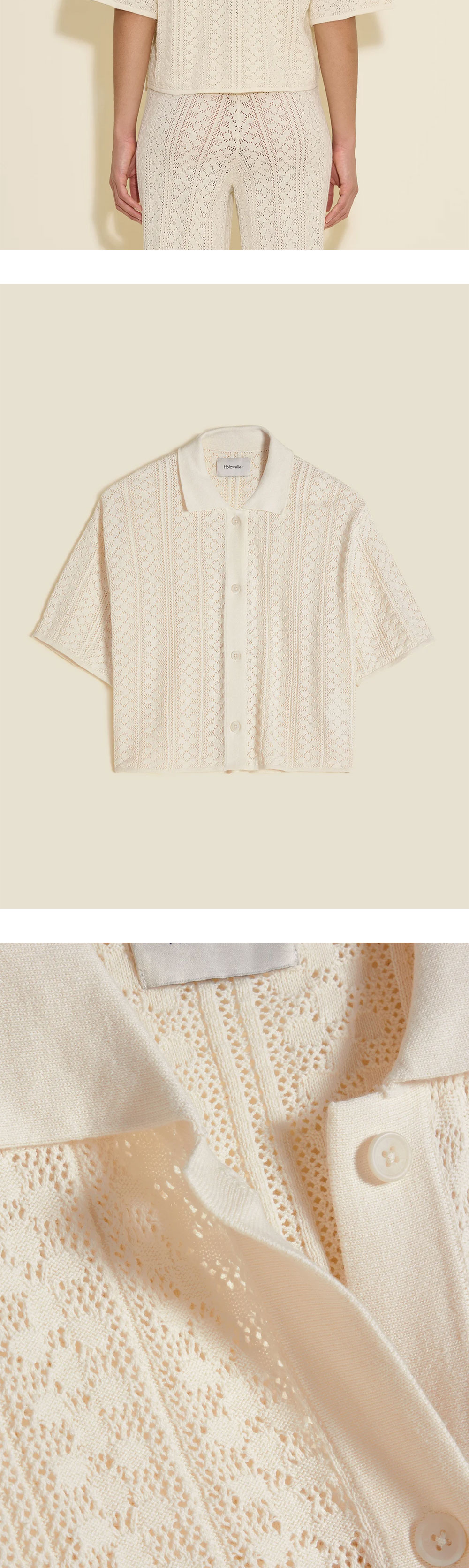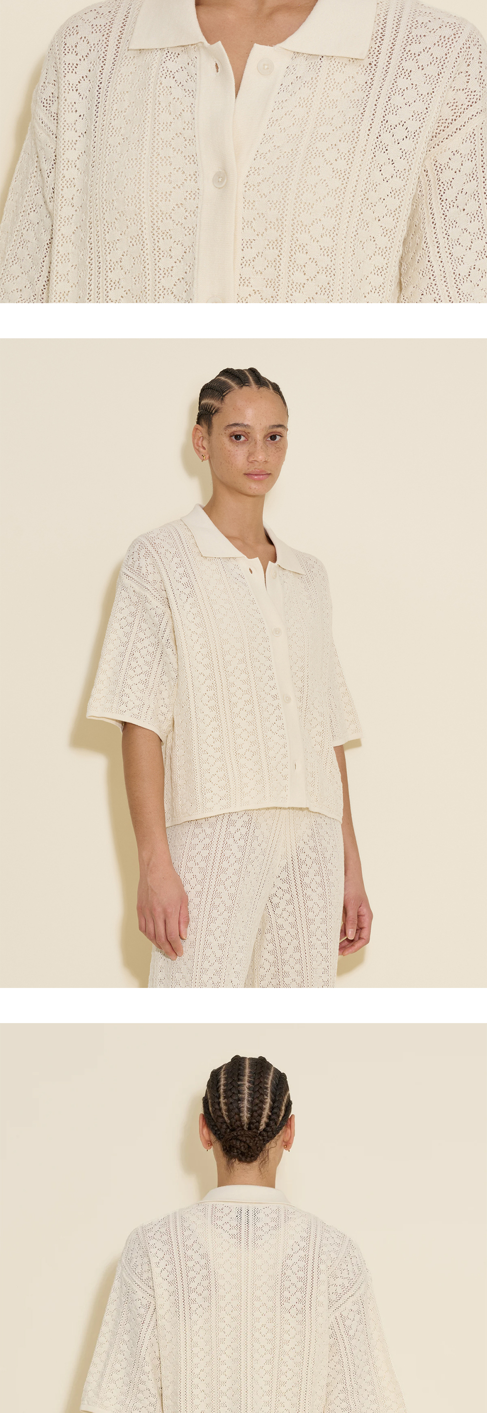 로크 크로셰 니트 셔츠는 순면 소재로 제작되어 부드러운 착용감을 주는 니트 셔츠입니다. 약간의 크롭한 실루엣과 넓은 숏슬리브 디자인이 특징적입니다. - 릴랙스드 핏 - 크롭한 길이 - 숏슬리브 - 앞면의 단추 여밈 * 모델은 173cm이며 XS 사이즈를 착용하였습니다.