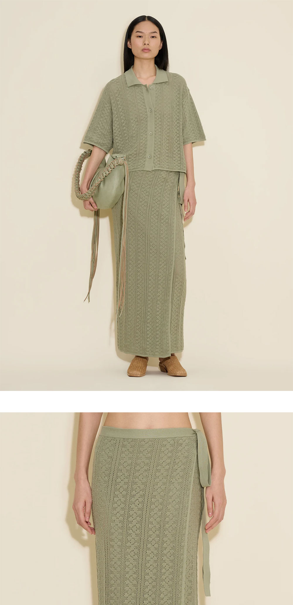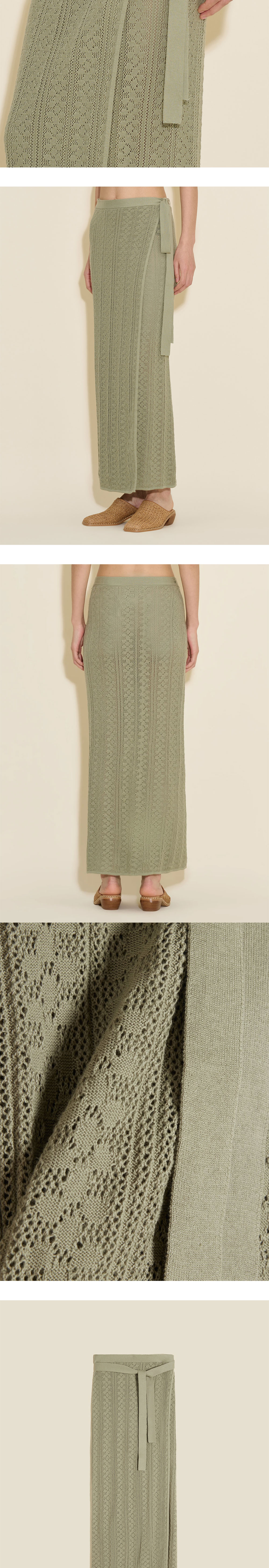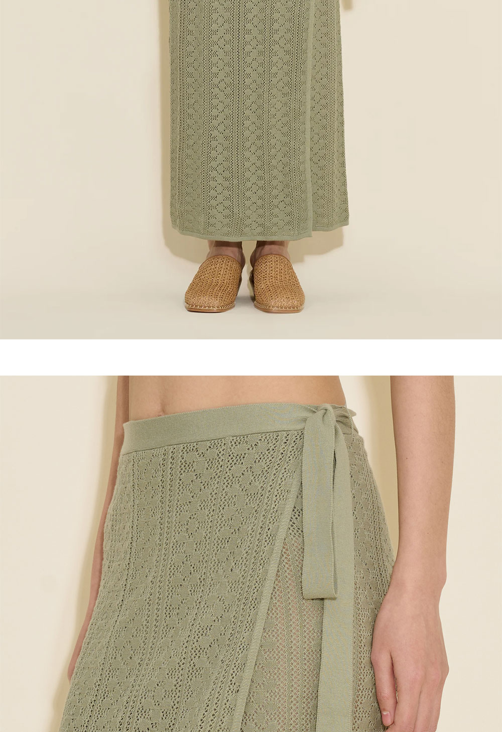 켈프 크로셰 니트 스커트는 순면 소재로 제작되어 부드러운 착용감을 주는 니트 스커트입니다. 랩 스타일의 실루엣으로, 허리 부분에 있는 타이를 묶어서 연출할 수 있습니다. - 슬림핏 - 랩 실루엣 - 하이라이즈 웨이스트 * 모델은 178cm이며 XS 사이즈를 착용하였습니다.