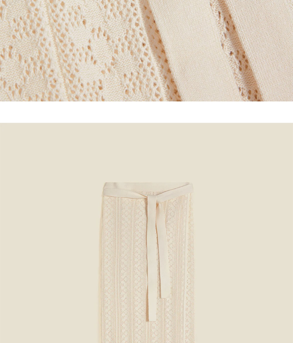 켈프 크로셰 니트 스커트는 순면 소재로 제작되어 부드러운 착용감을 주는 니트 스커트입니다. 랩 스타일의 실루엣으로, 허리 부분에 있는 타이를 묶어서 연출할 수 있습니다. - 슬림핏 - 랩 실루엣 - 하이라이즈 웨이스트 * 모델은 175cm이며 XS 사이즈를 착용하였습니다.