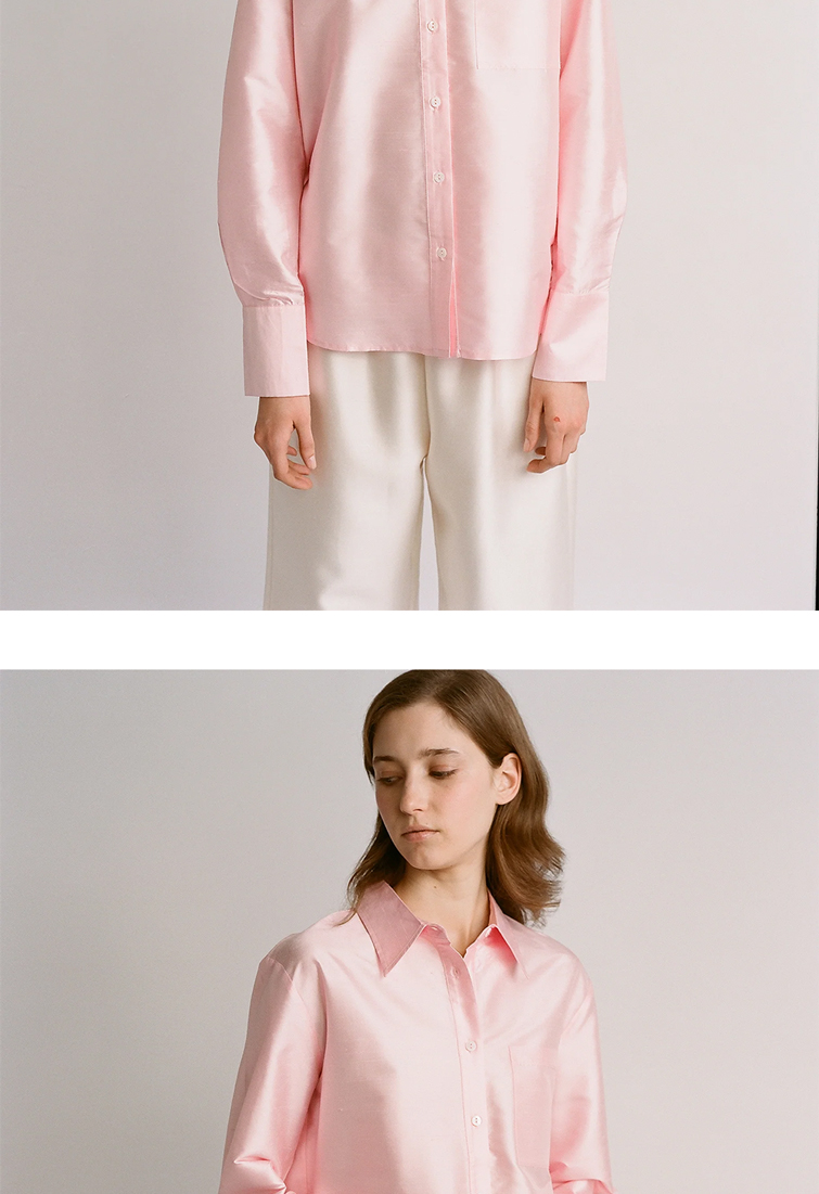 살짝 루즈한 핏과 샤프한 칼라, 그리고 오버사이즈 소매가 특징인 핑크 컬러의 셔츠입니다. 듀피온 원단은 불규칙한 위사와 섬세한 날실이 조합되어 만들어졌으며, 원단 특성상 슬라브가 있어 일반 새틴 실크에 비해 특징적인 질감을 보여줍니다. - 듀피온 실크 100% - 신축성이 없는 가벼운 소재 - 오버사이즈 핏 *모델 신체 스펙 - 177cm / 착용 사이즈 - S