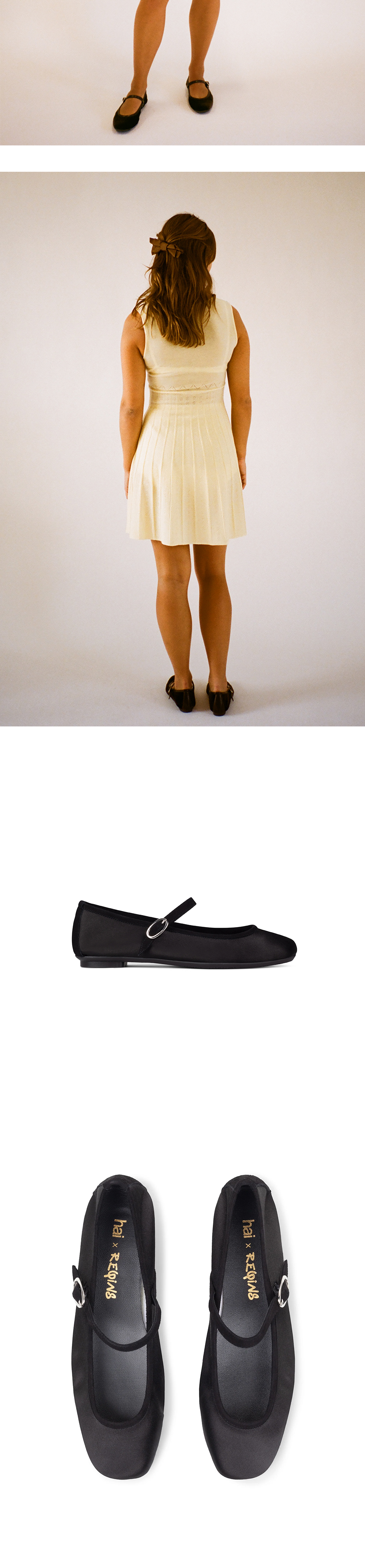 블랙 새틴 실크 소재의 Hai x Reqins 플랫 메리 제인 플랫은 둥근 모양의 앞코와 고무 밑창이 있어 편안함을 선사합니다. 이 신발은 스트랩 버클 잠금장치로 고정되어 있으며 더 오래 걸을 때 착용하도록 설계되었습니다. - 새틴 실크 및 스웨이드 - 스웨이드 트리밍 - 둥근 앞코 - 스트랩 버클 잠금장치 - 고무 밑창