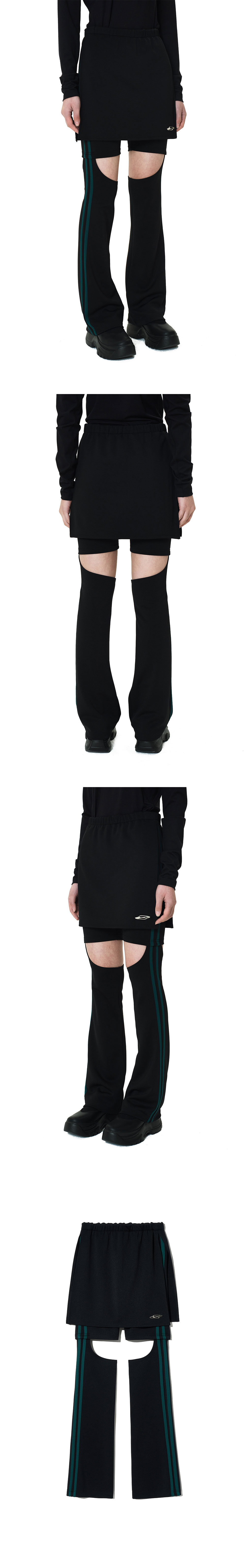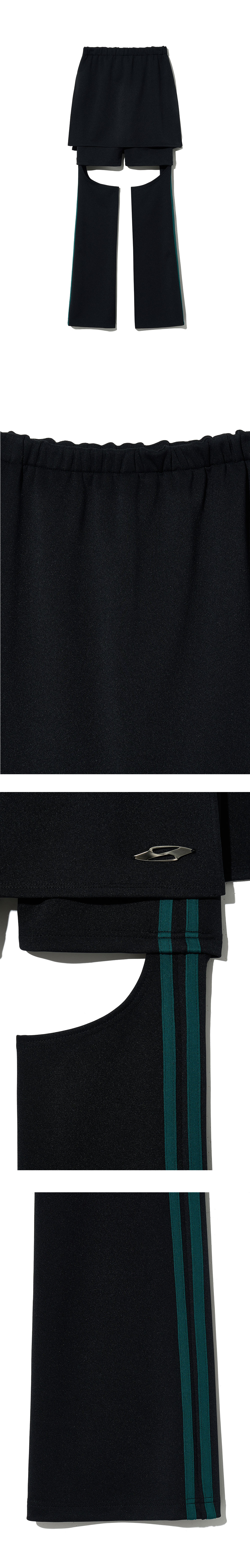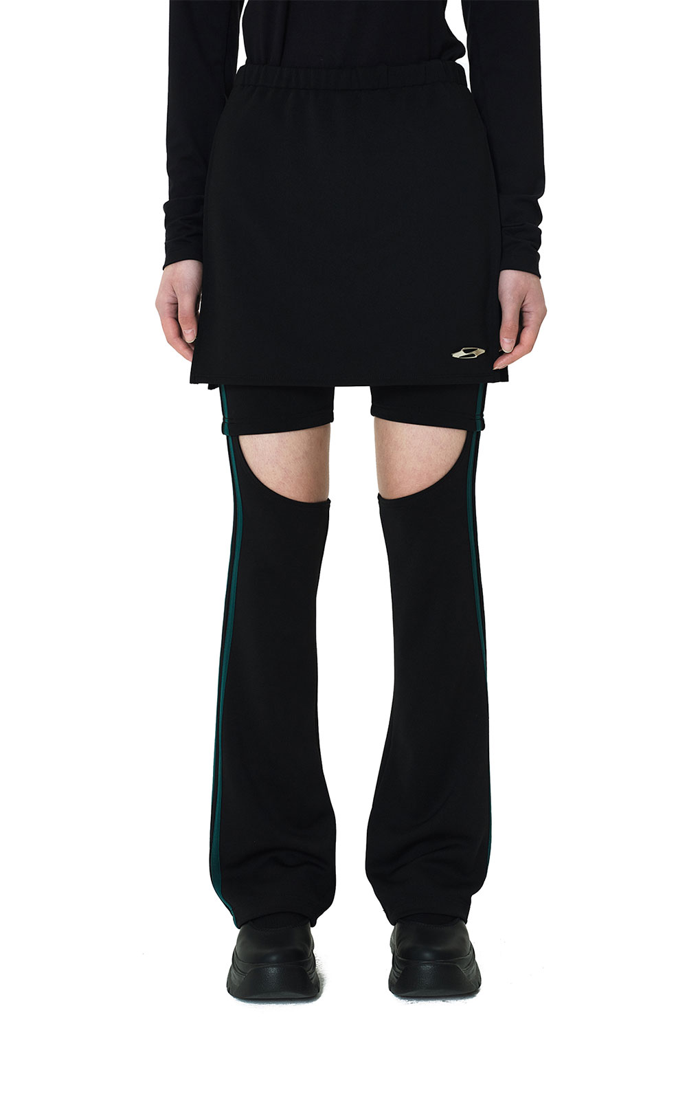 스커트와 레깅스를 따로 레이어 한 듯한 외관을 선보이는 팬츠 신축성이 뛰어난 스트레치 소재와 허리 라인 전체 밴딩을 블록 다리 라인 양옆의 입체감 있는 배색 트리밍 아이덴티티 금속 심볼 장식으로 포인트 컷아웃 디테일