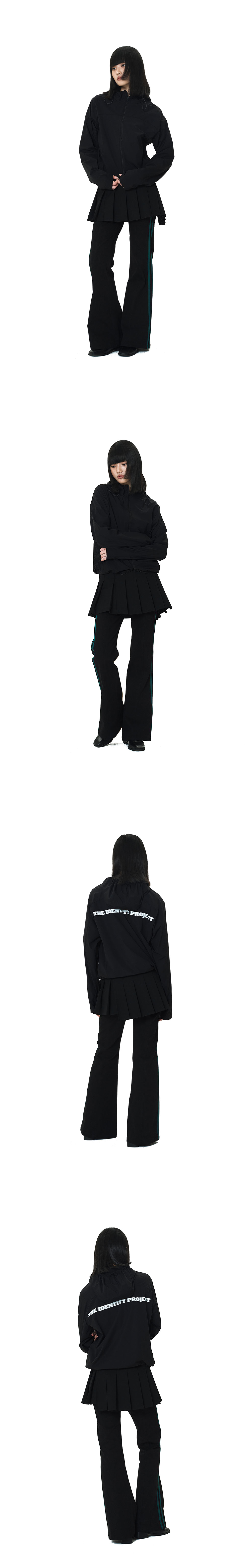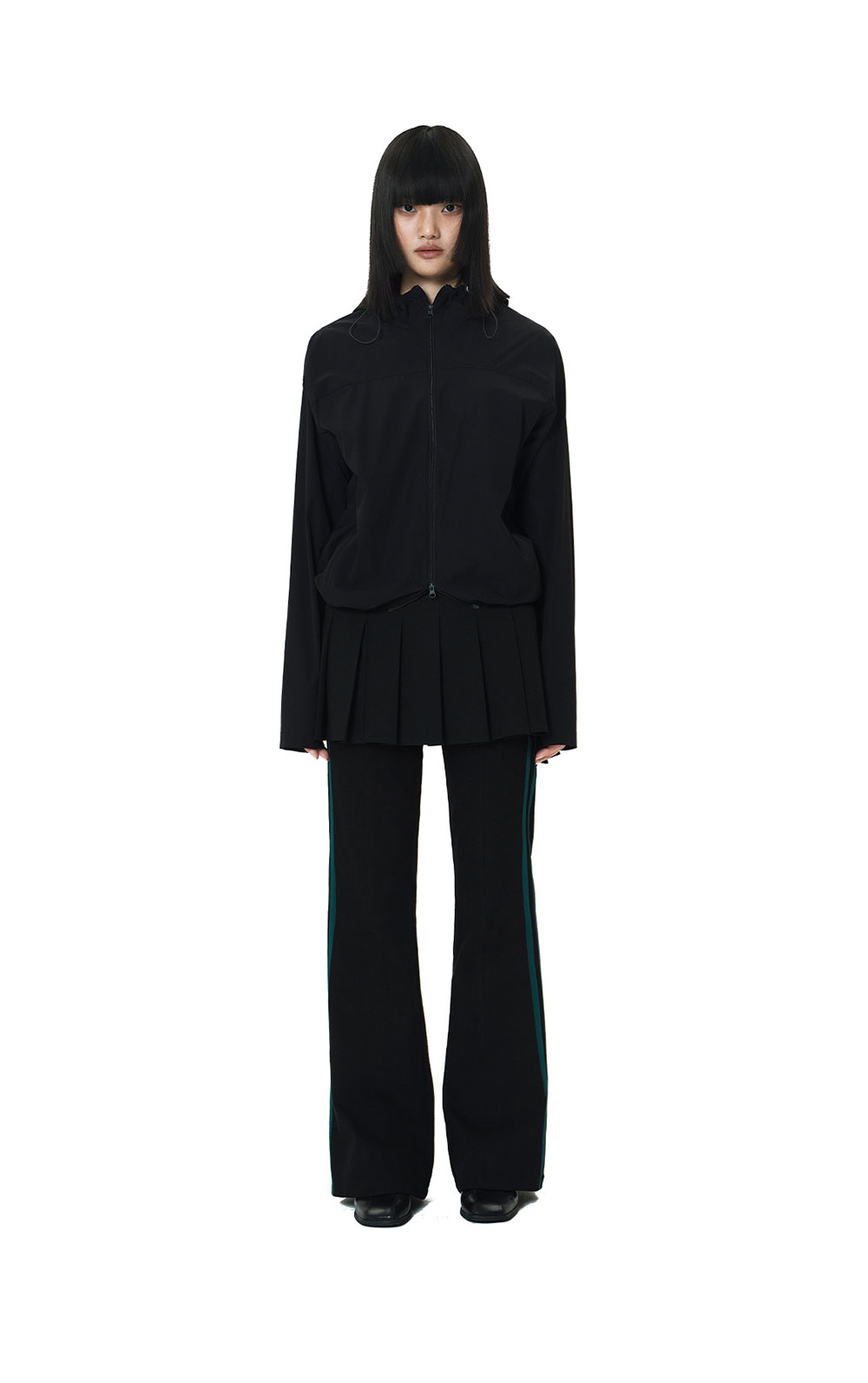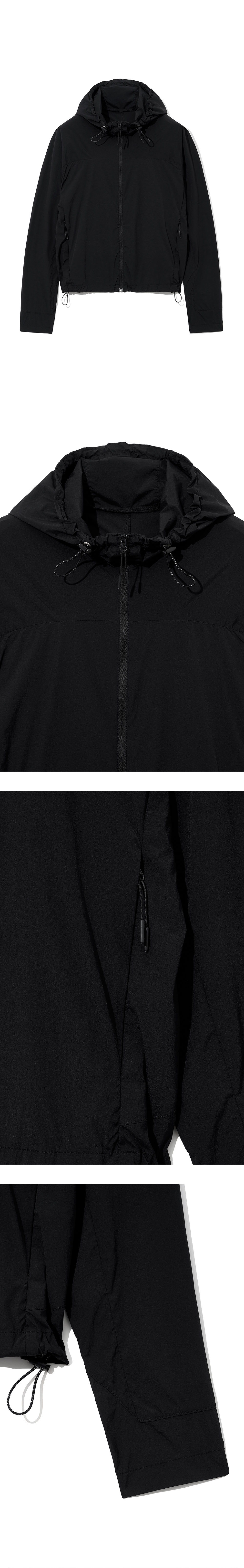 PA 82% PU 18% 나일론과 폴리우레탄 섬유를 혼합하여 만든 기능성 소재. 신축성이 뛰어나 활동하기에 편하고 내구성, 발한성, 건조성이 뛰어나 기능성 아웃도어로 많이 사용되는 신소재. waterproof (발수가공) nylon zipper hem line string hoody hidden pocket Digital printing Crop
