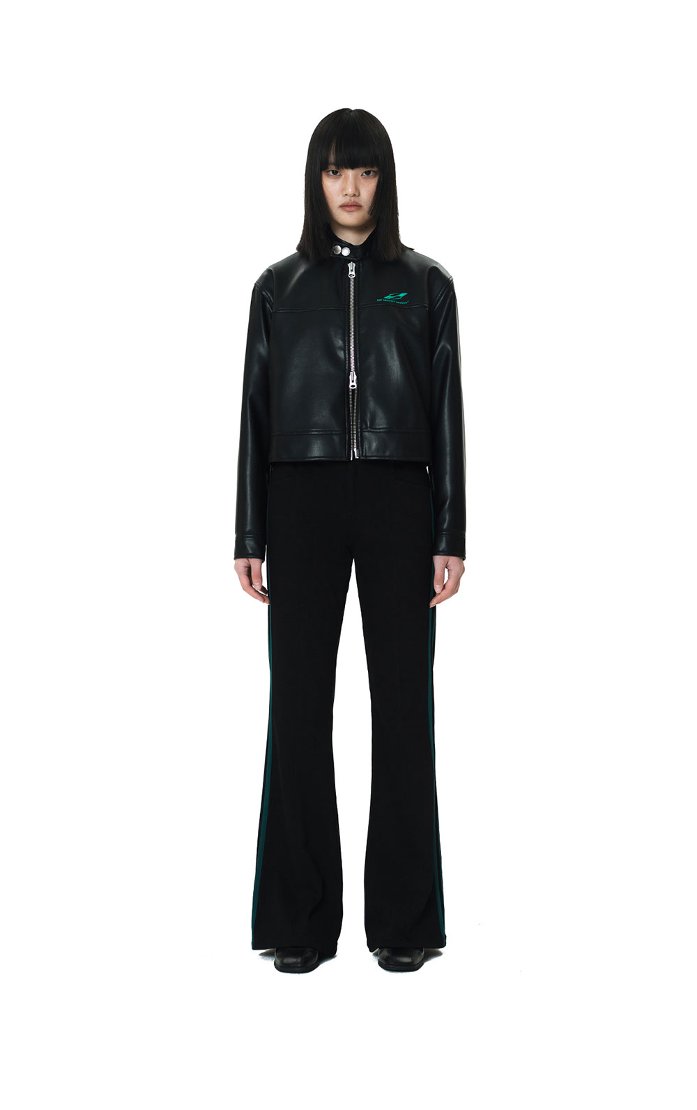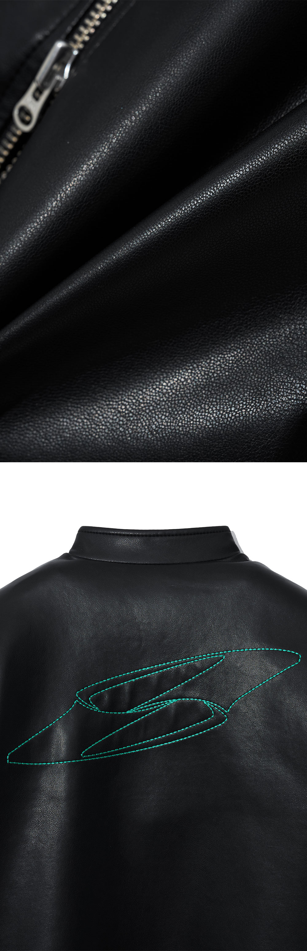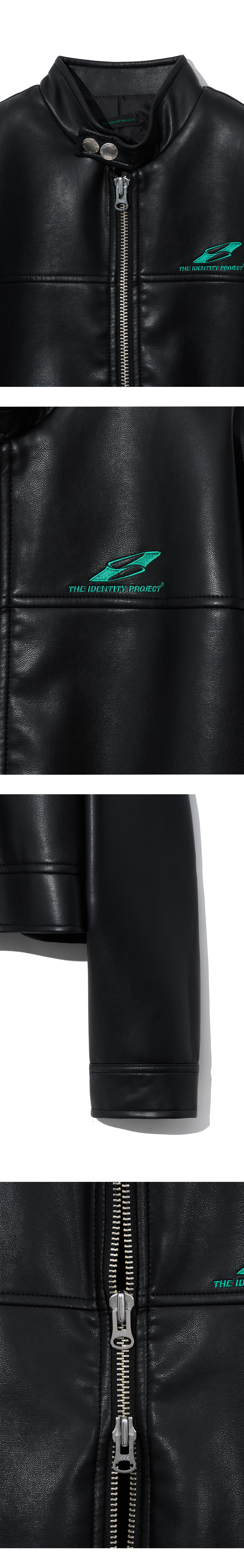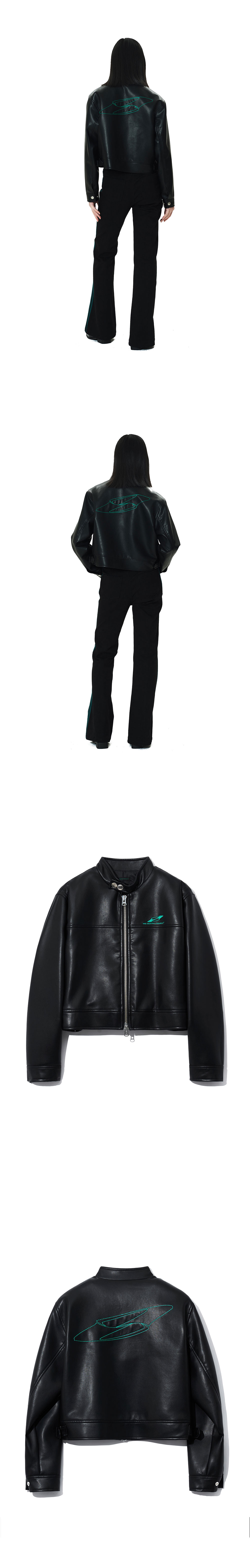 자연스러운 광택감의 페이크 레더 소재를 사용 스탠드 칼라 YKK 투웨이 지퍼 클로징으로 한층 실용적으로 연출가능 아이덴티티 스티치 자수 아트워크 아이덴티티 각인 돗드 스냅 크롭 기장과 어깨 라인이 자연스럽게 맞는 레귤러 핏 옆면 밑단에 버클로 실루엣 조절