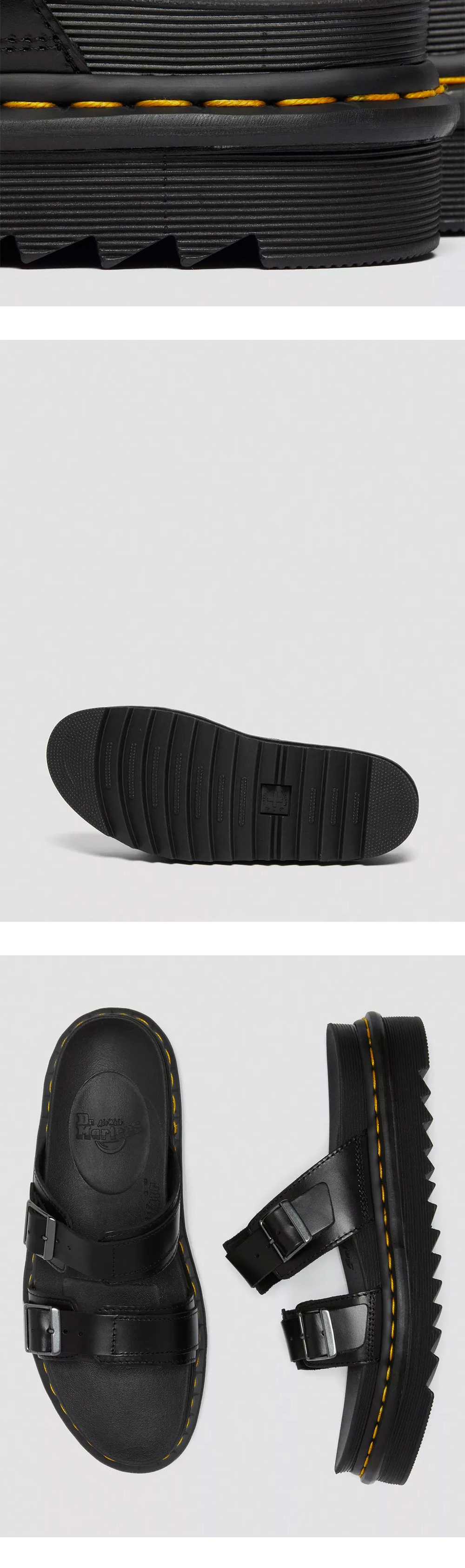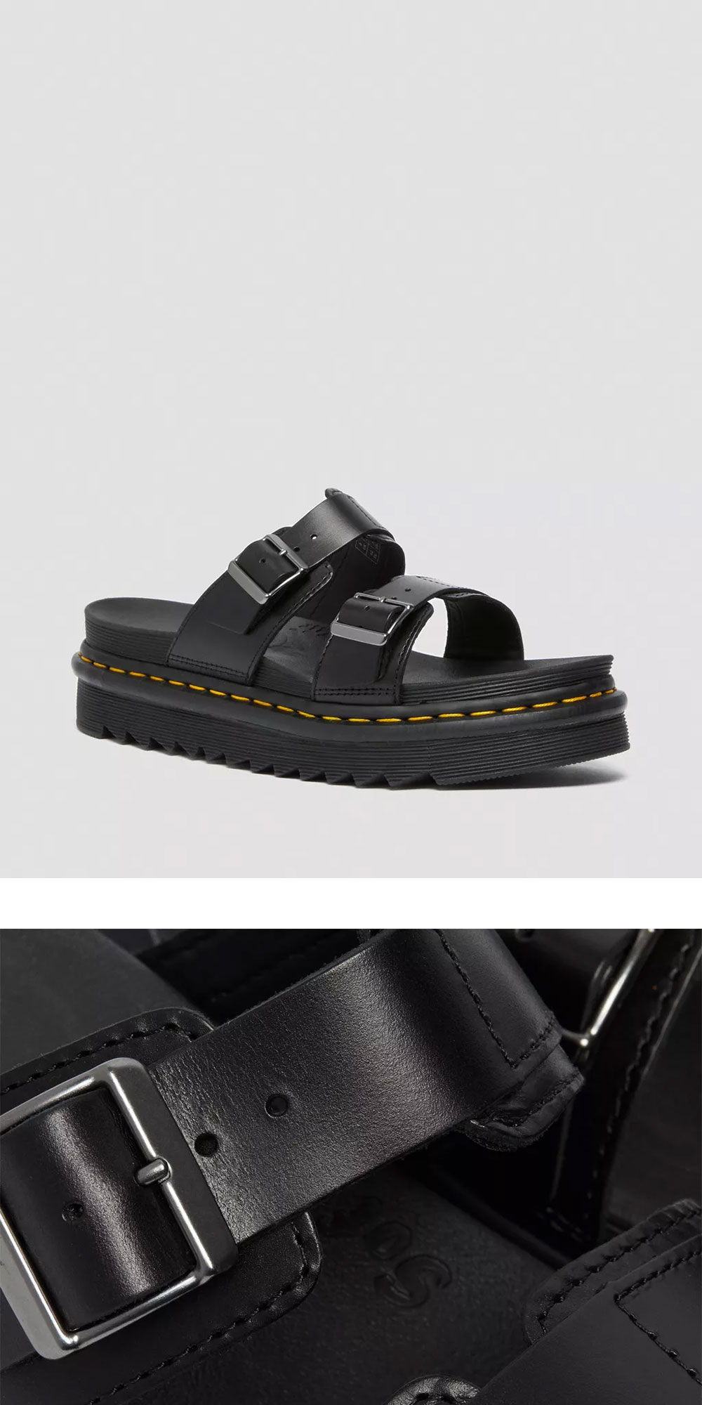 튼튼하고 가벼운 리플 솔로 제작되어 편안한 착용감을 선사하는 닥터마틴의 마일즈 브란도 레더 버클 슬라이드 샌들입니다. - 두 개의 조절 가능한 버클 스트랩 - 굿이어 웰트 방식으로 갑피와 밑창이 열로 밀봉되고 함께 봉제되어, 오랫동안 더 큰 편안함과 내구성 제공 - 반 사이즈의 경우, 한 치수 작게 선택 권장