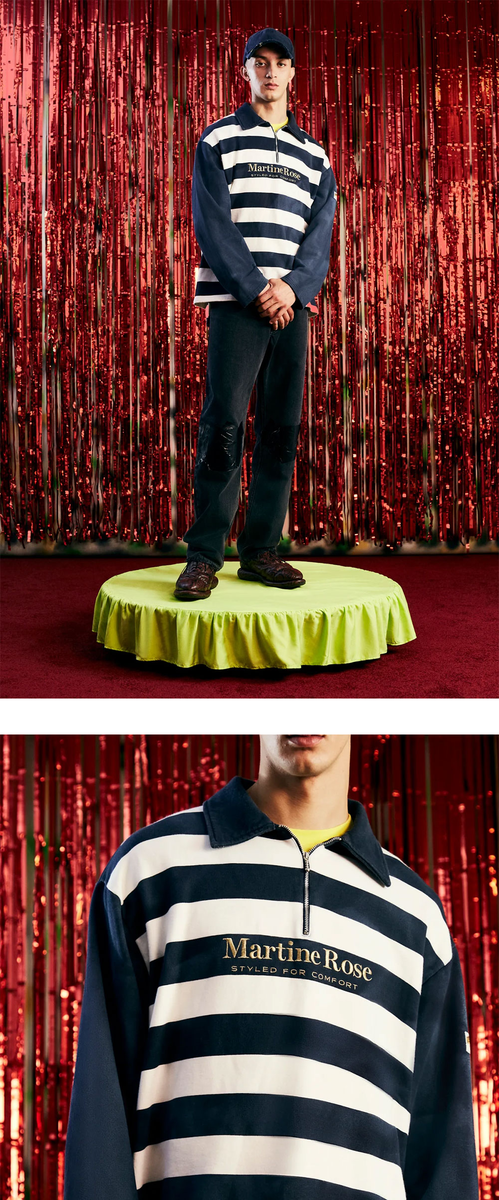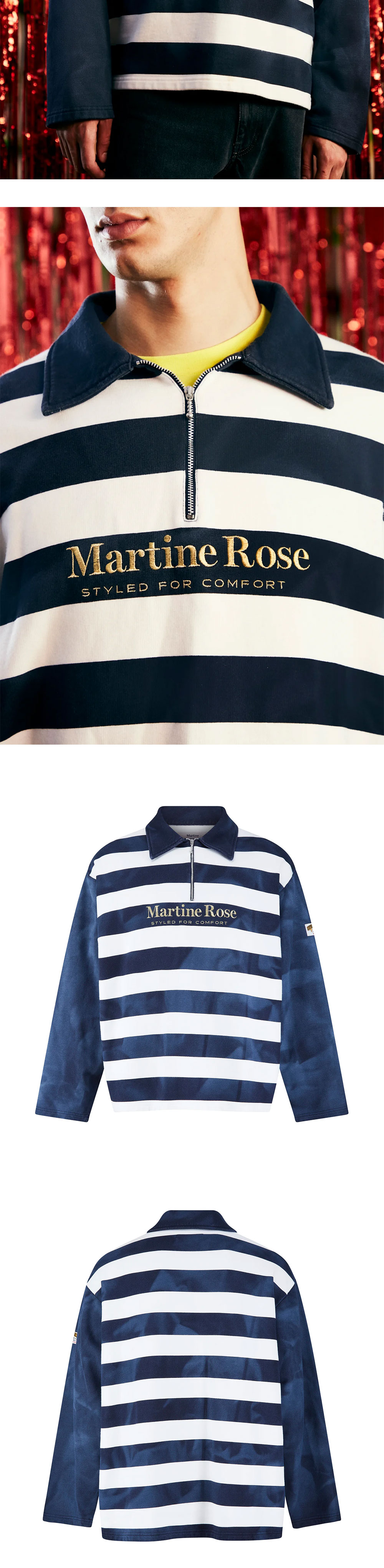 워싱된 스트라이프 저지로 만들어진 마틴로즈의 집업 폴로입니다. 가슴 전면에 'Martine Rose'와 'STYLED FOR COMFORT'가 금색 자수로 수놓여 있는 것이 특징입니다. - 롱 슬리브 집업 폴로 셔츠 - 목 부분의 쿼터 지퍼 클로저 - 왼팔 소매 부분의 브랜드 라벨 | 사이즈 가이드 | - 모델: 188cm - 착용 사이즈: S