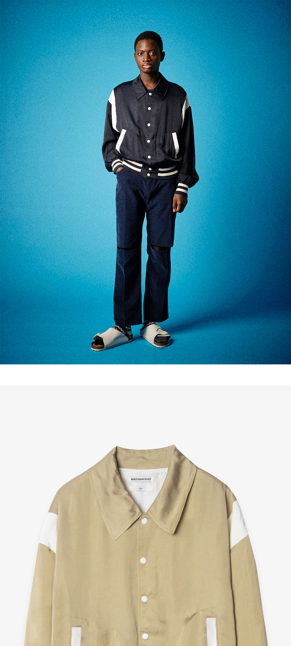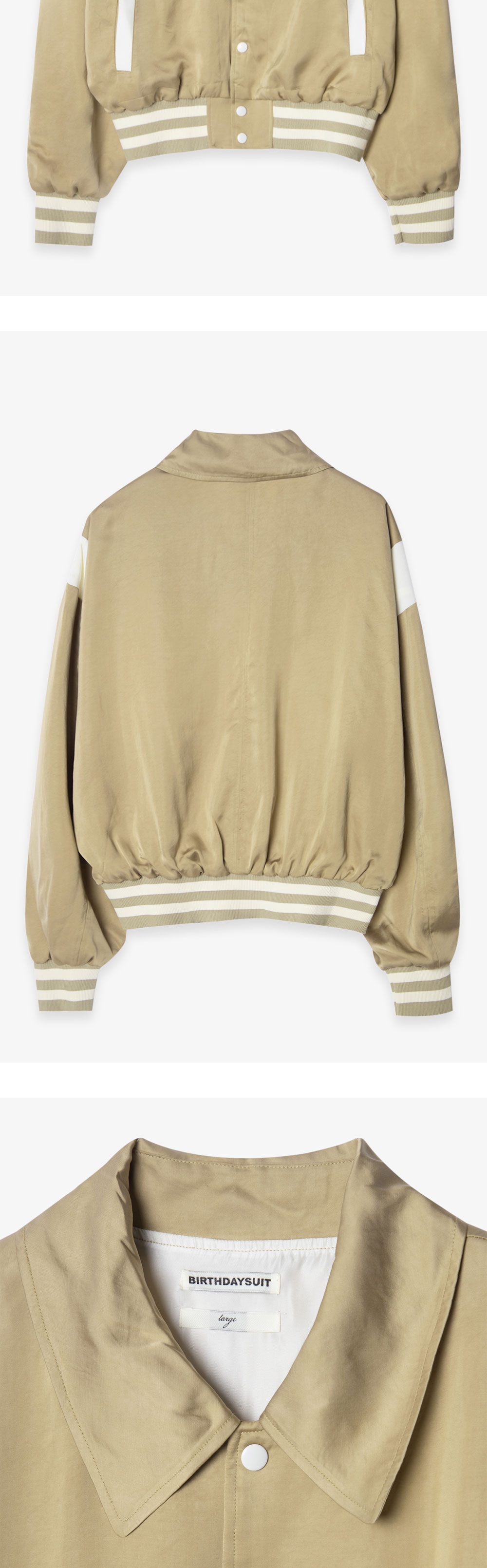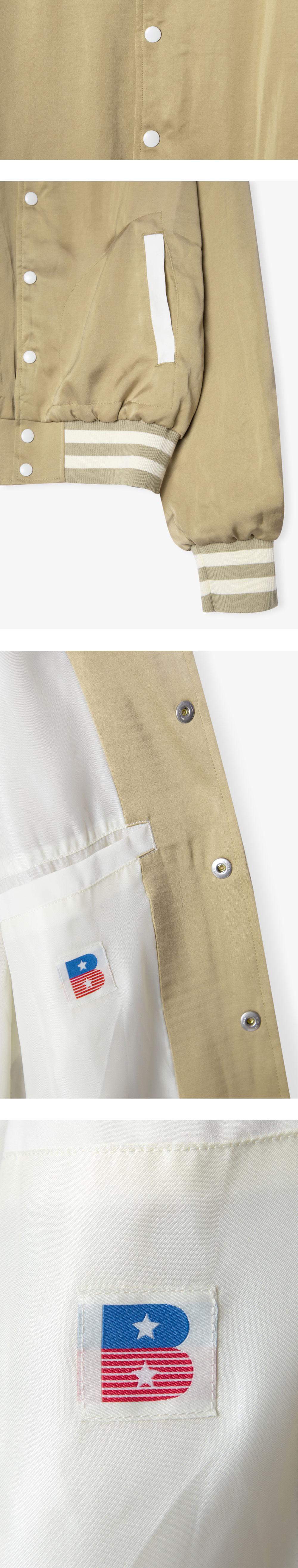 SATIN STADIUM JACKET은 벌스데이수트가 전개하는 상품 중 매년 가장 많은 사랑을받고 있는 베스트 셀러 라인으로 비스코스 모달 혼방 원단을 사용하여 제작된 스타디움 재킷입니다. 비스코스 소재 특유의 뛰어난 통기성과 부드러운 텍스처를 느낄 수 있으며, 암홀과 포켓에 조화로운 컬러 웨이 패턴이 위트를 더하였습니다. 여유로운 오버핏 실루엣으로 소매와 밑단은 스트라이프 패턴으로 포인트를 주었으며, 리브 조직으로 마감 처리하여 재킷의 실루엣을 부드럽게 잡아줍니다. *상세 이미지 내 모델이 착용한 상품의 경우, 동일한 상품의 타 컬러인 점 참고 부탁드립니다.