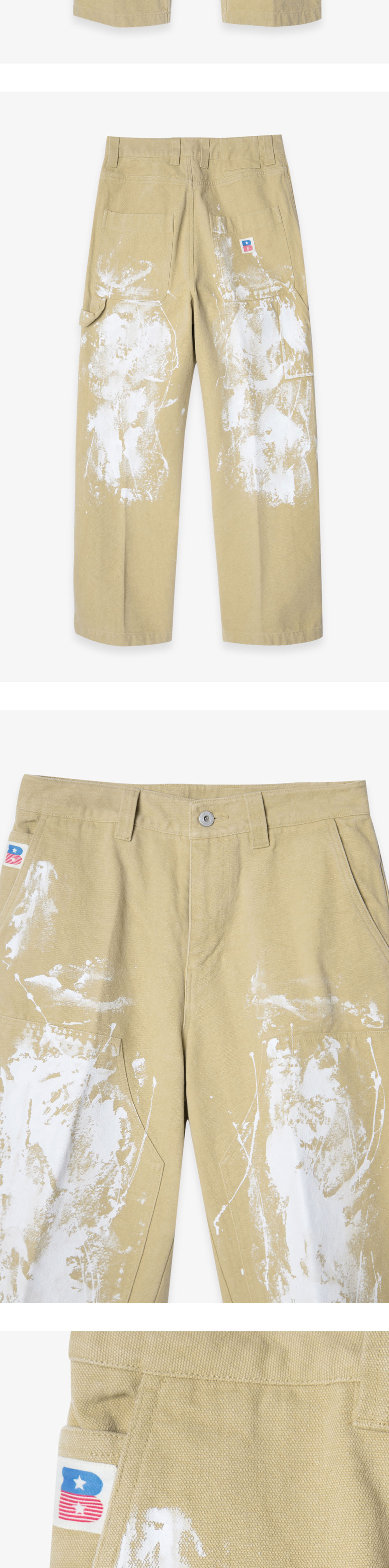 PAINTED CARPENTER PANTS는 탄탄한 내구성을 느낄 수 있는 코튼 원단으로 제작된 팬츠입니다. 목수나 도장공이 작업을 위해 착용하였던 워크 팬츠를 모티브로 공구 포켓 혹은 망치를 걸 수 있는 루프 디테일을 담아냈습니다. 전후면 존재하는 페인팅과 벌스데이수트의 시그니처 로고인 B 로고를 삽입하여 포인트를 주었으며, 와이드 핏 실루엣으로 착용됩니다. *상세 이미지 내 모델이 착용한 상품의 경우, 동일한 상품의 네이비 컬러인 점 참고 부탁드립니다.