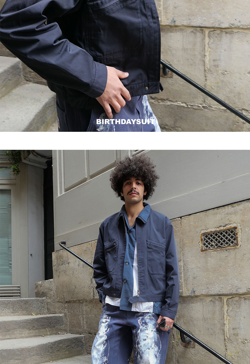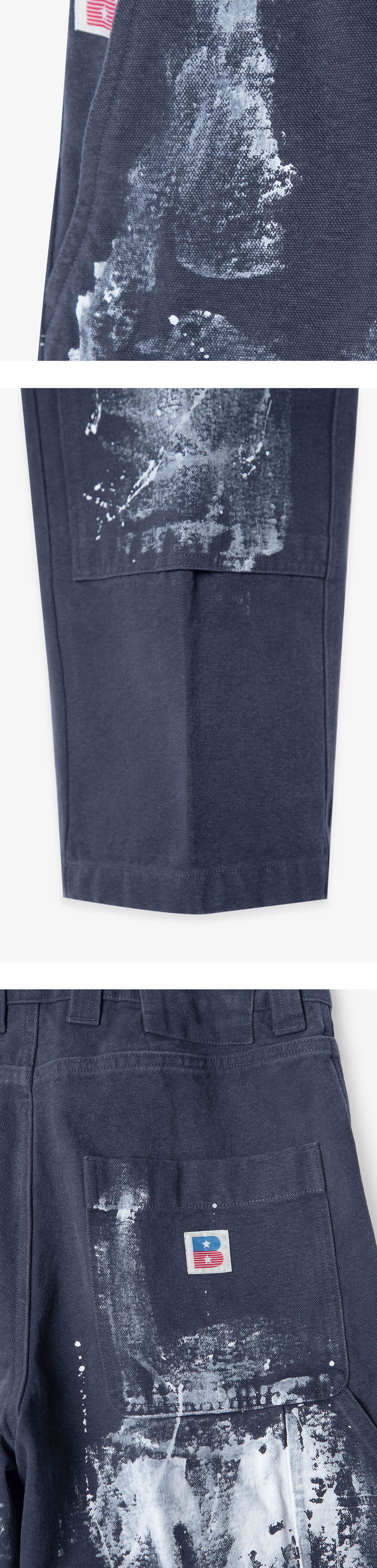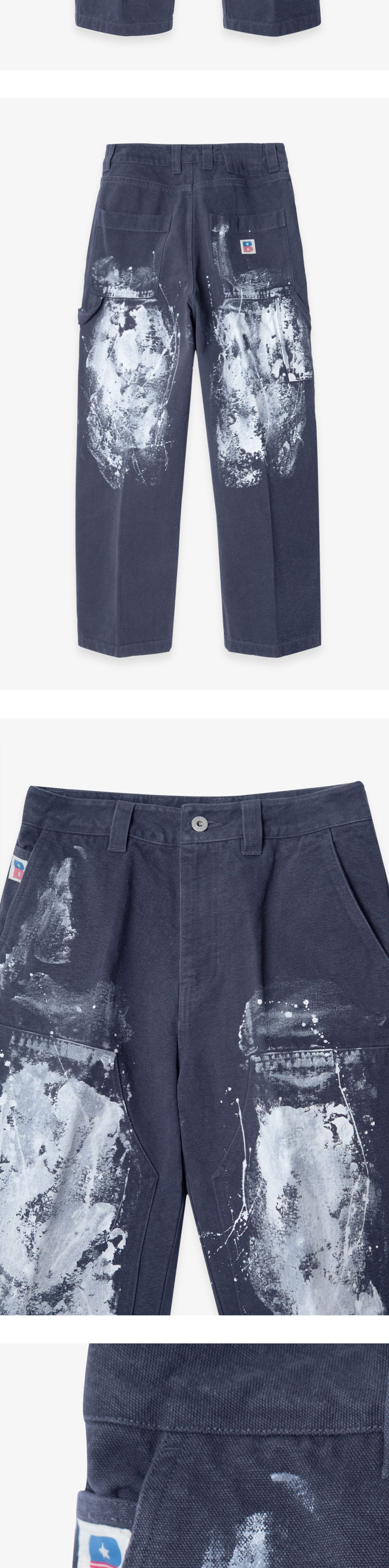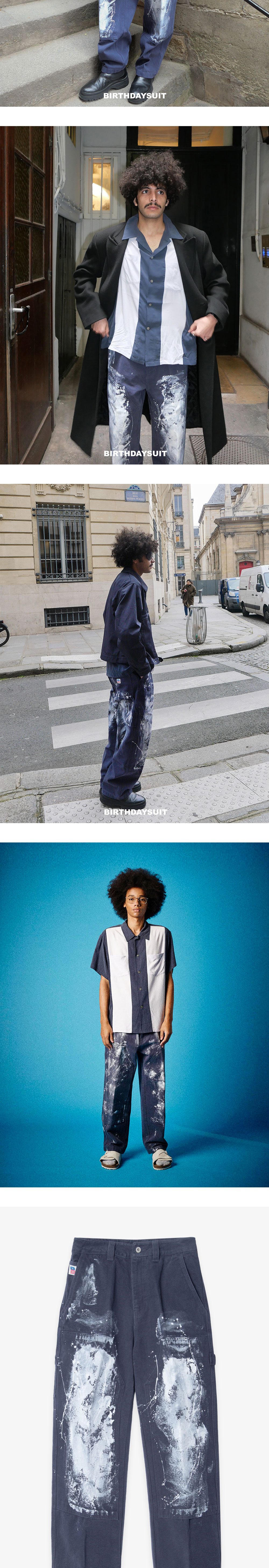 PAINTED CARPENTER PANTS는 탄탄한 내구성을 느낄 수 있는 코튼 원단으로 제작된 팬츠입니다. 목수나 도장공이 작업을 위해 착용하였던 워크 팬츠를 모티브로 공구 포켓 혹은 망치를 걸 수 있는 루프 디테일을 담아냈습니다. 전후면 존재하는 페인팅과 벌스데이수트의 시그니처 로고인 B 로고를 삽입하여 포인트를 주었으며, 와이드 핏 실루엣으로 착용됩니다.