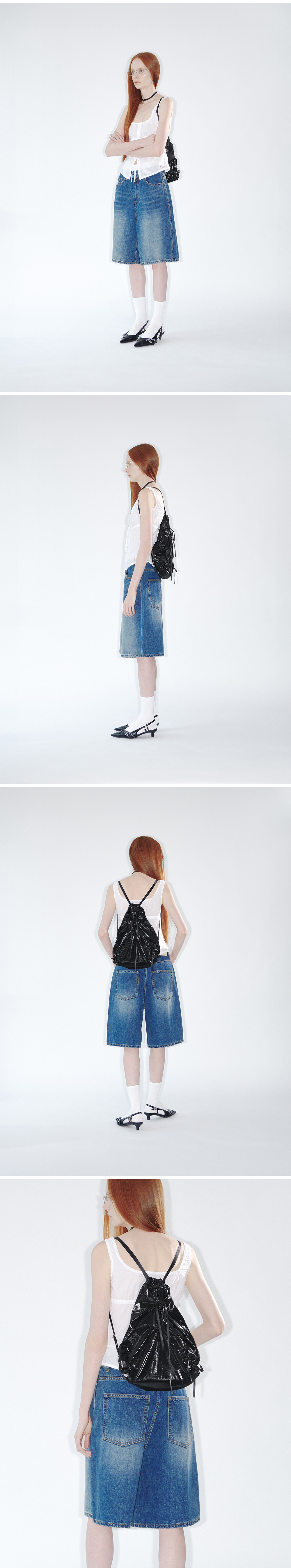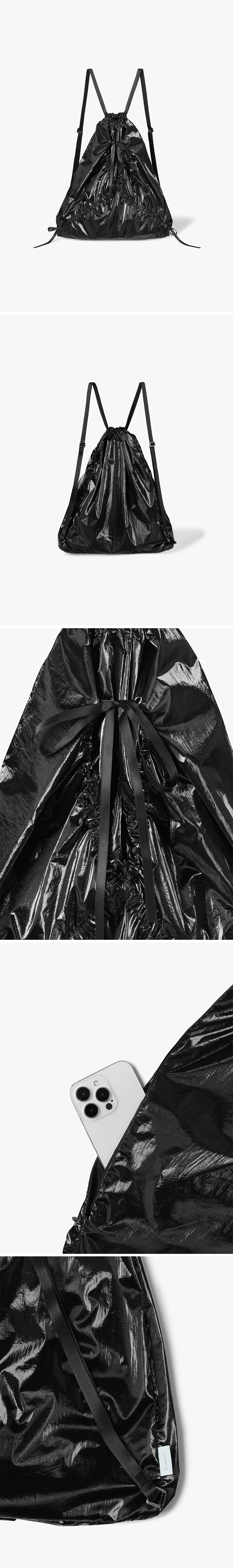 * 리본과 셔링이 포인트가 되는 가벼운 짐색 * 글로시한 광택이 감도는 나일론 소재 사용 * 길이 조절이 가능한 스트랩과 사이드 지퍼 구성으로 가볍고 실용적이게 착용 가능한 아이템