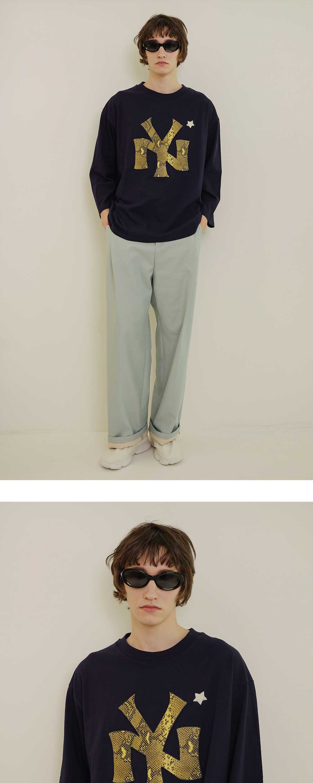 ㆍ세미 오버핏으로 여유로운 실루엣 연출 ㆍ'THE NEW WILD' 아카이브 상품 ㆍ오가닉 코튼 원사로 제작 ㆍ덤블워싱&텐타가공으로 세탁 후 변형 최소화 ㆍ전면 파이톤소재 아플리케 디테일 ㆍ9부 기장 슬리브 ㆍ남녀공용 착용 ㆍ여성분들은 M사이즈 착용 권장