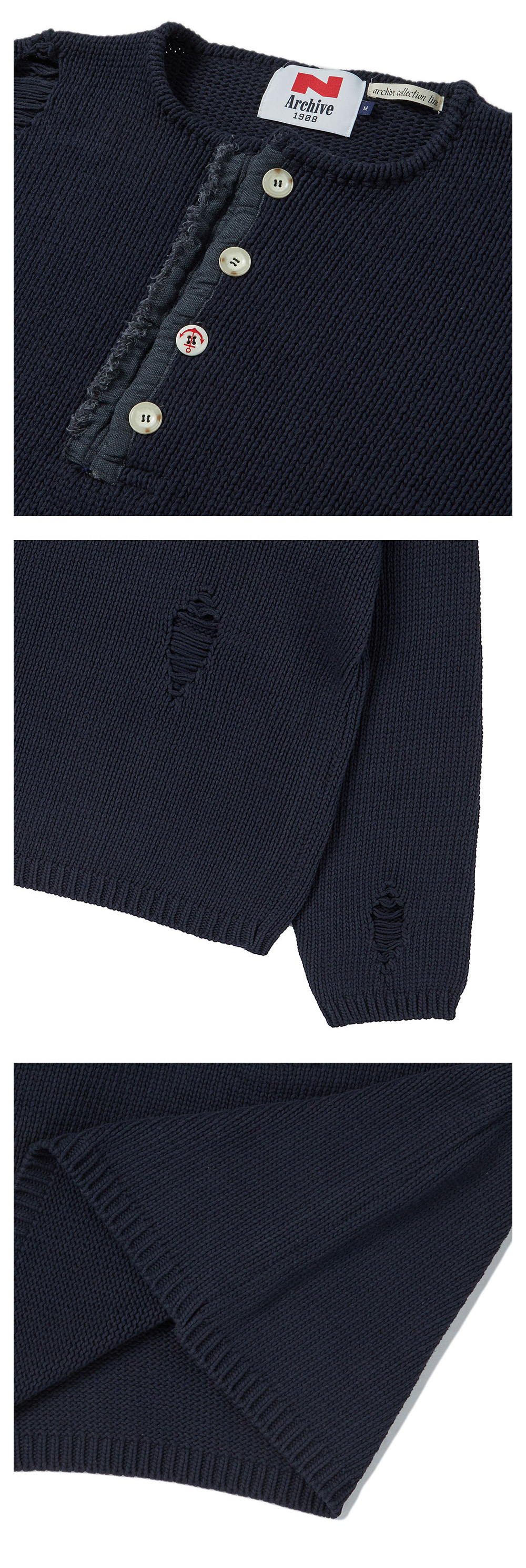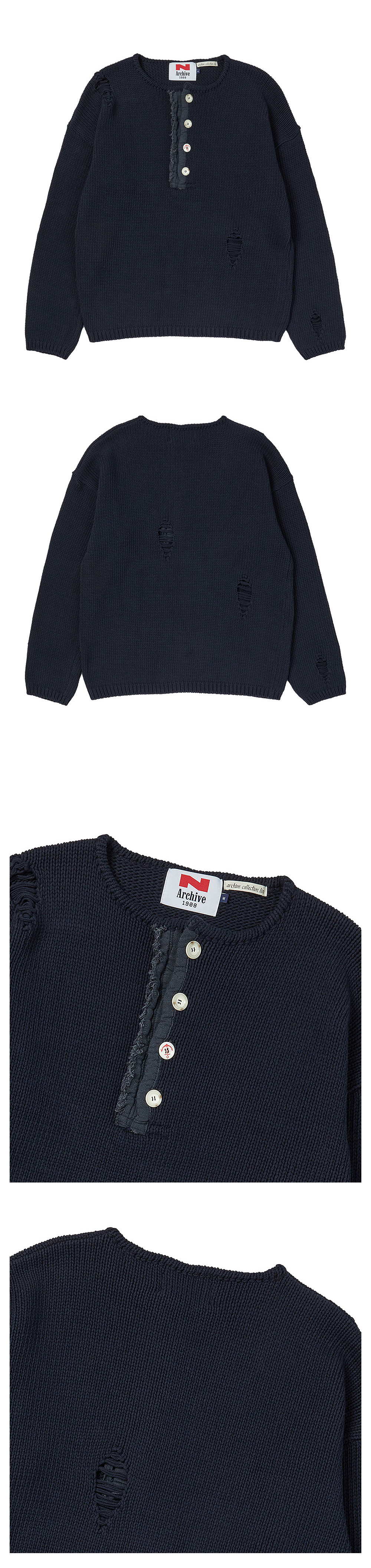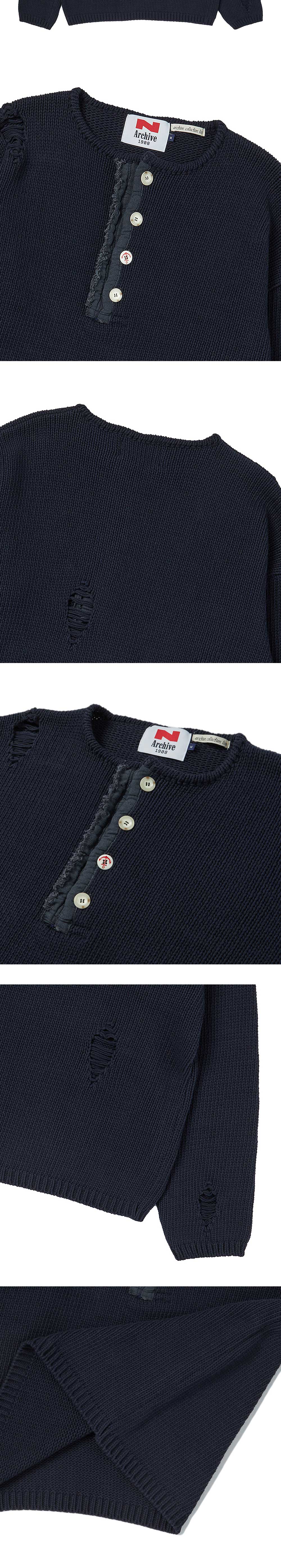 엔 아카이브 아카이브 헤비 웨이트 코튼 데미지 디테일 헨리넥 니트 네이비