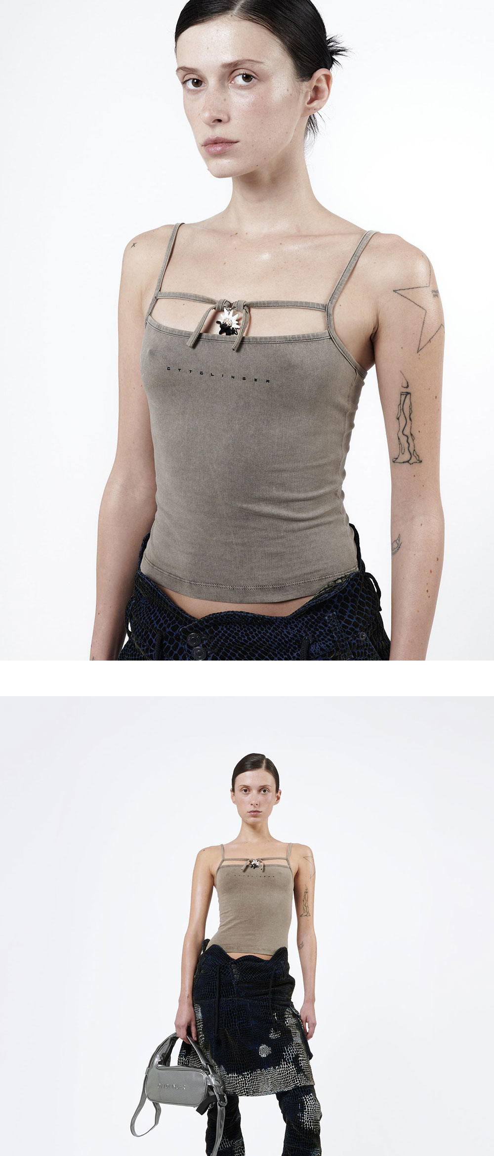 몸에 딱 붙는 핏이 매력적인 오토링거 참드 탑입니다. 가슴 중앙의 하트 펜던트가 특징입니다. - 가슴 부분에 로고 참이 달린 스퀘어 넥 - 전면 로고 프린트 - 조절 가능한 스트랩 - 빈티지한 워싱 * 상품마다 참 부분의 개체별 차이가 있을 수 있습니다. * 모델 스펙 : 177cm / 착용 사이즈 : XS