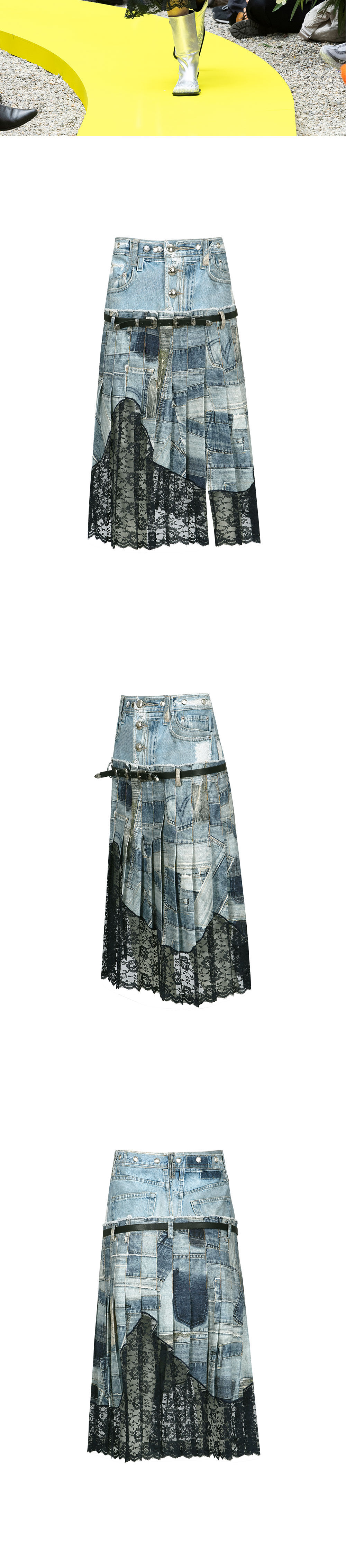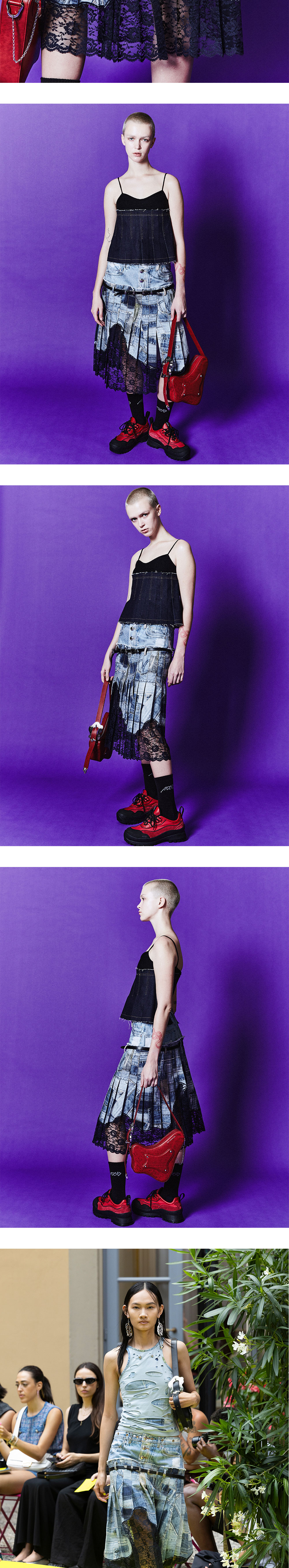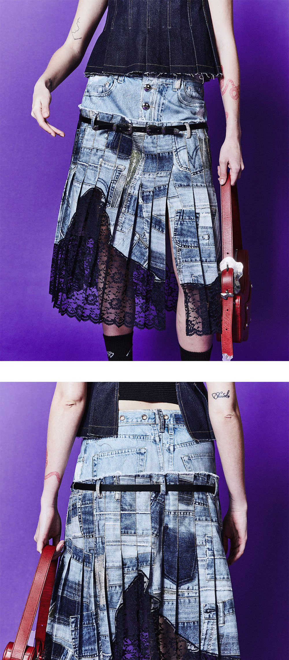 - 데님 TROMPE L`OEIL 프린트 - 캔톤 오프닝 - 덧장 & 벨트 디테일 - 슬릿 디테일 - 밑단 레이스 플리츠 & 절개라인