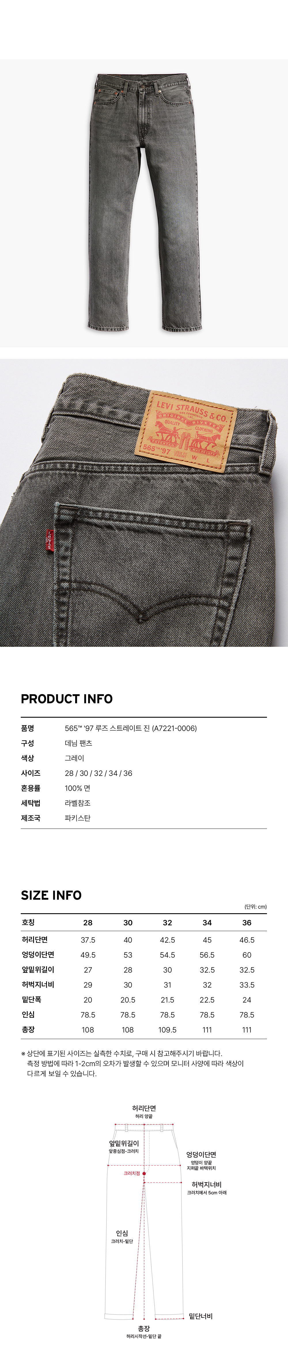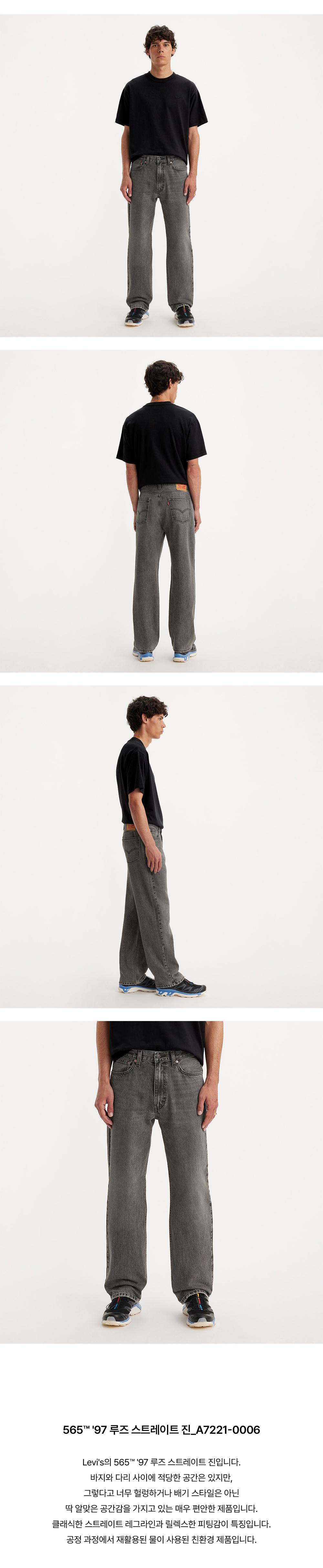 Levi's의 565™ '97 루즈 스트레이트 진입니다. 바지와 다리 사이에 적당한 공간은 있지만, 그렇다고 너무 헐렁하거나 배기 스타일은 아닌 딱 알맞은 공간감을 가지고 있는 매우 편안한 제품입니다. 클래식한 스트레이트 레그라인과 릴렉스한 피팅감이 특징입니다. 공정 과정에서 재활용된 물이 사용된 친환경 제품입니다.