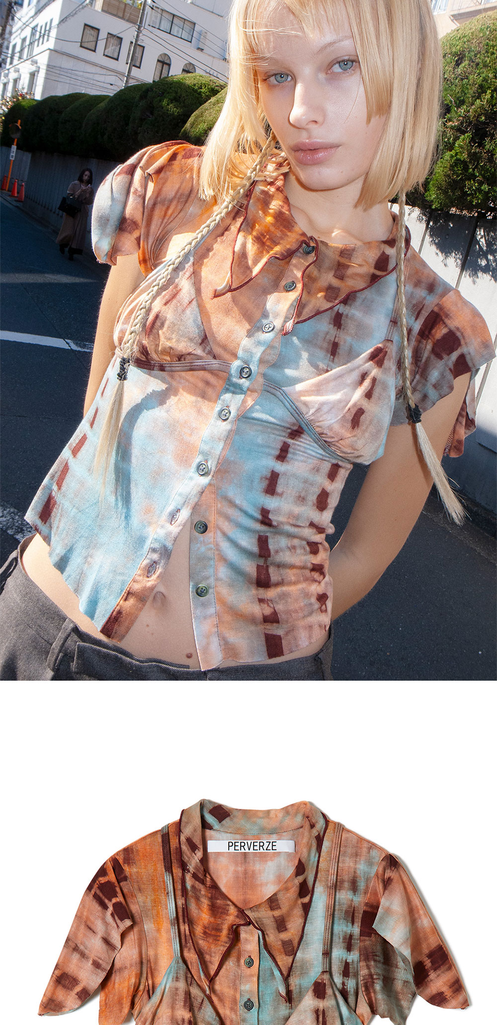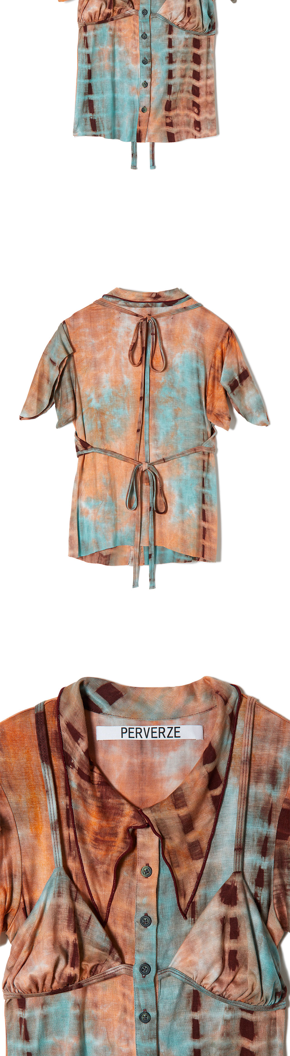 퍼버즈만의 타이다이 패턴으로 룩에 포인트를 줄 수 있는 퍼버즈의 브라 레이어드 셔츠 탑입니다. - 타이다이 패턴 - 슬림 핏의 브라탑 레이어드 디자인 - 전면 버튼 클로저 * 원단 특성 상 각 개체의 패턴이 다를 수 있습니다. * 모델 신체 스펙 : 175cm
