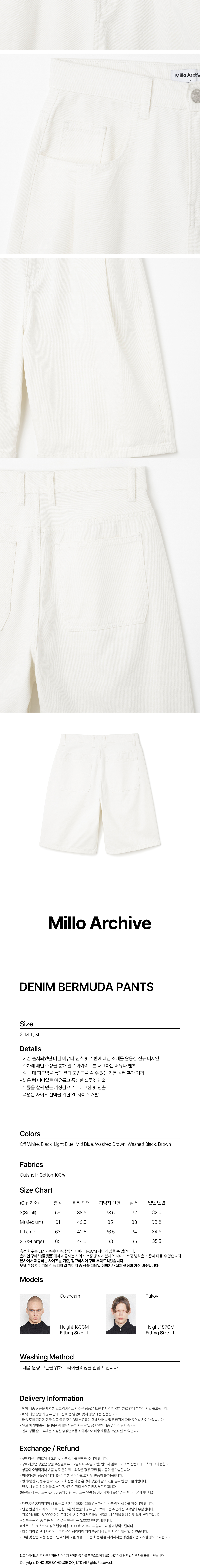 - 기존 출시되었던 데님 버뮤다 팬츠 핏 기반에 데님 소재를 활용한 신규 디자인 - 수차례 패턴 수정을 통해 밀로 아카이브를 대표하는 버뮤다 팬츠 - 실 구매 피드백을 통해 코디 포인트를 줄 수 있는 기본 컬러 추가 기획 - 넓은 턱 디테일로 여유롭고 풍성한 실루엣 연출 - 무릎을 살짝 덮는 기장감으로 유니크한 핏 연출 - 폭넓은 사이즈 선택을 위한 XL 사이즈 개발 코이샴: 183cm L SIze 착용 투코브: 187cm L SIze 착용