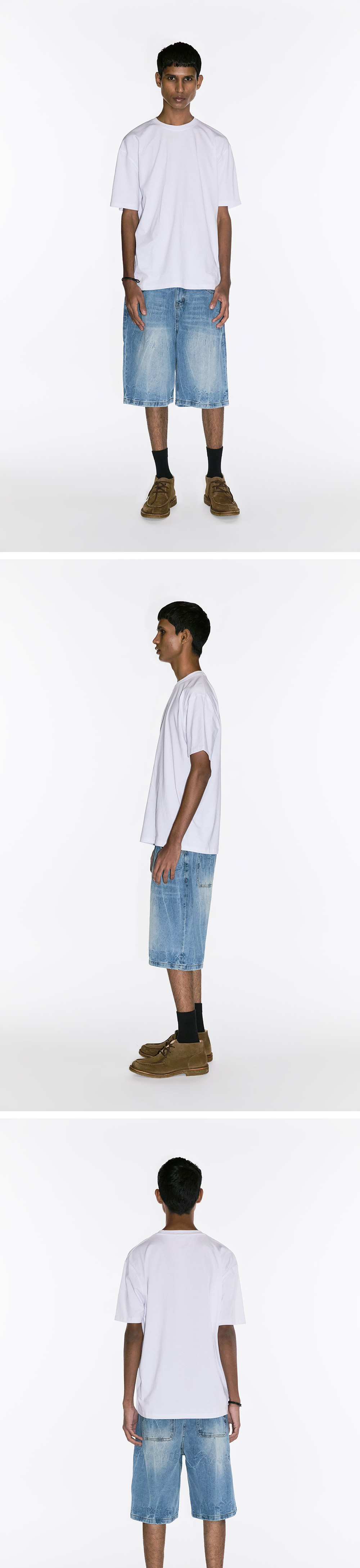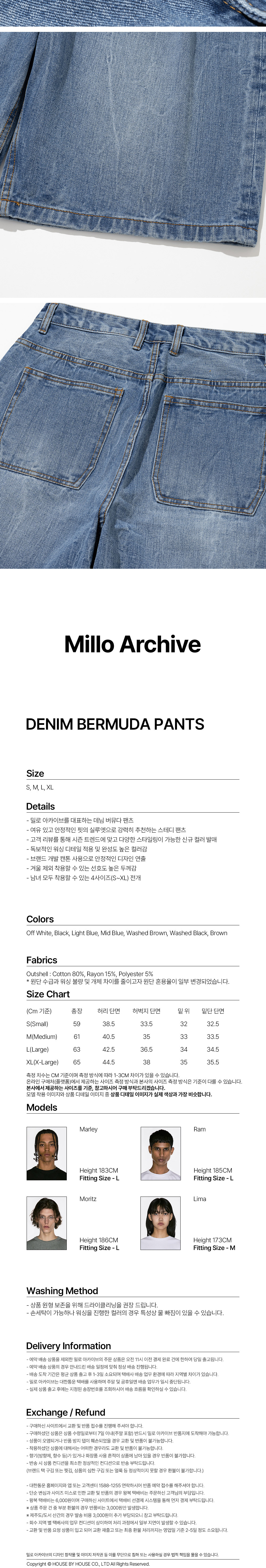 - 스테디 아이템인 미니멀리스트 버뮤다 팬츠 핏을 기초하여 준비한 데님 버뮤다 팬츠 - 넓은 턱 디테일로 여유롭고 풍성한 실루엣 연출 - 무릎을 살짝 덮는 기장감으로 유니크한 핏 연출 - 리플렉트 커브드 팬츠의 감각적인 워싱을 일부 도입 - 유니크한 워싱 디테일로 완성도를 높힘 - 자연스러운 워싱 디테일 - 폭넓은 사이즈 선택을 위한 XL 사이즈 개발 - 남녀 모두 착용 가능한 여유 있는 실루엣 팬츠
