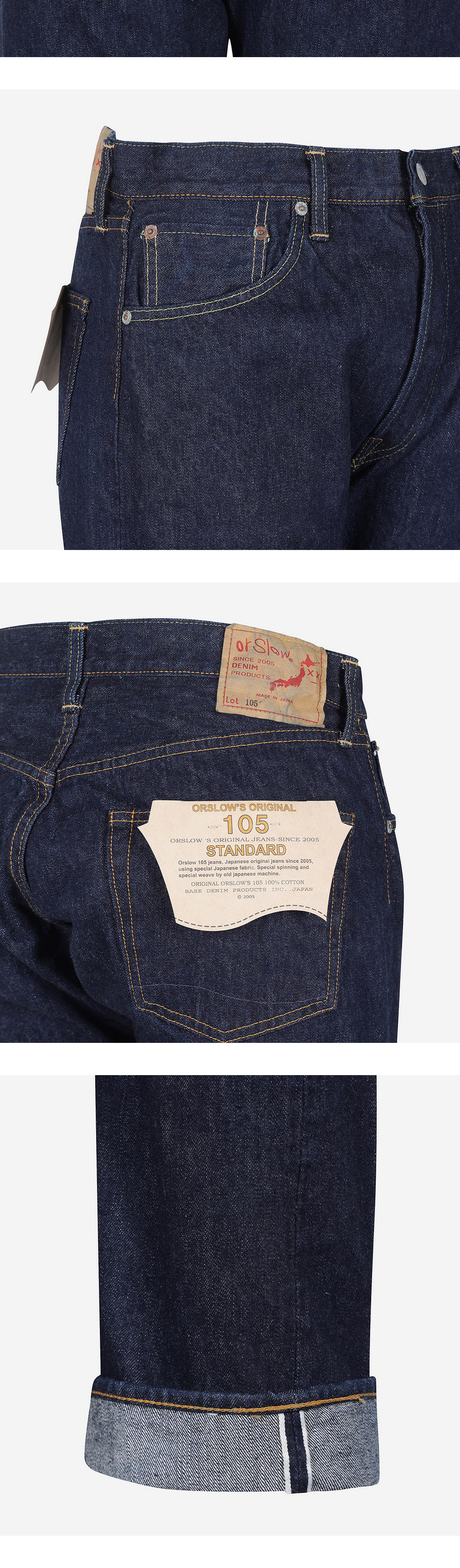 오어슬로우만의 클래식한 매력이 돋보이는 105 스탠다드 셀비지 데님 원 워시입니다. 반복적인 착용과 세탁을 통해 빈티지 데님을 연상시키는 독특한 페이딩 경험을 제공하는 제품입니다. - 105 스탠다드 원 워싱 - 13.5oz 셀비지 데님 - 5포켓 스트레이트 진 - 전면 버튼 플라이 - 특별 처리된 실을 사용하여 직조된 원단