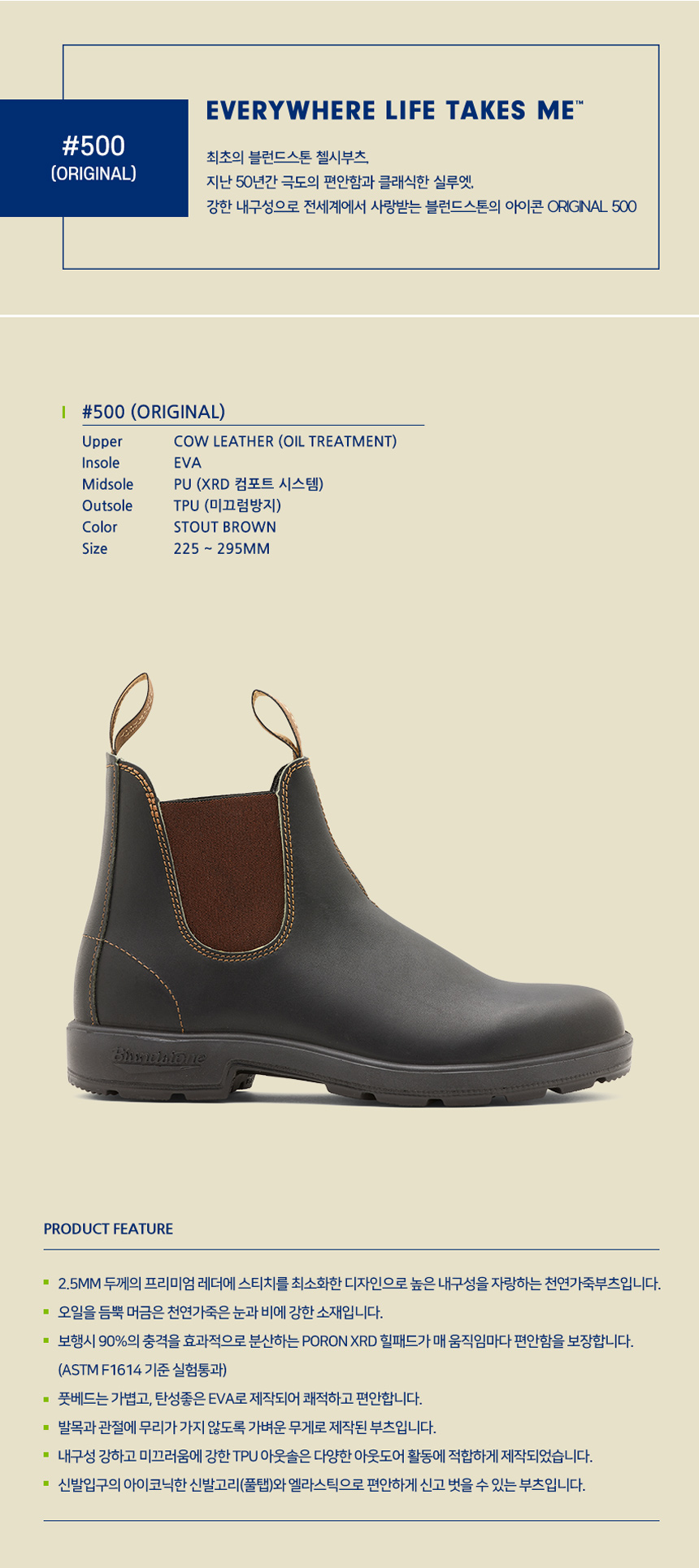MAKING LIGHT WORK OF HARD WORK FOR 150 YEARS. 블런드스톤 부츠 하나면 충분 합니다. 1870년 부터 150년간 오직 부츠만 만들어 온 호주의 블런드스톤은 압도적인 내구성과 편안함으로 오늘날 세계에서 가장 사랑받는 첼시부츠 입니다. ORIGINAL #500 최초의 블런드스톤 첼시부츠 지난 50년간 극도의 편안함과 클래식한 실루엣. 강한 내구성으로 전세계에서 사랑받는 블런드스톤 아이콘.