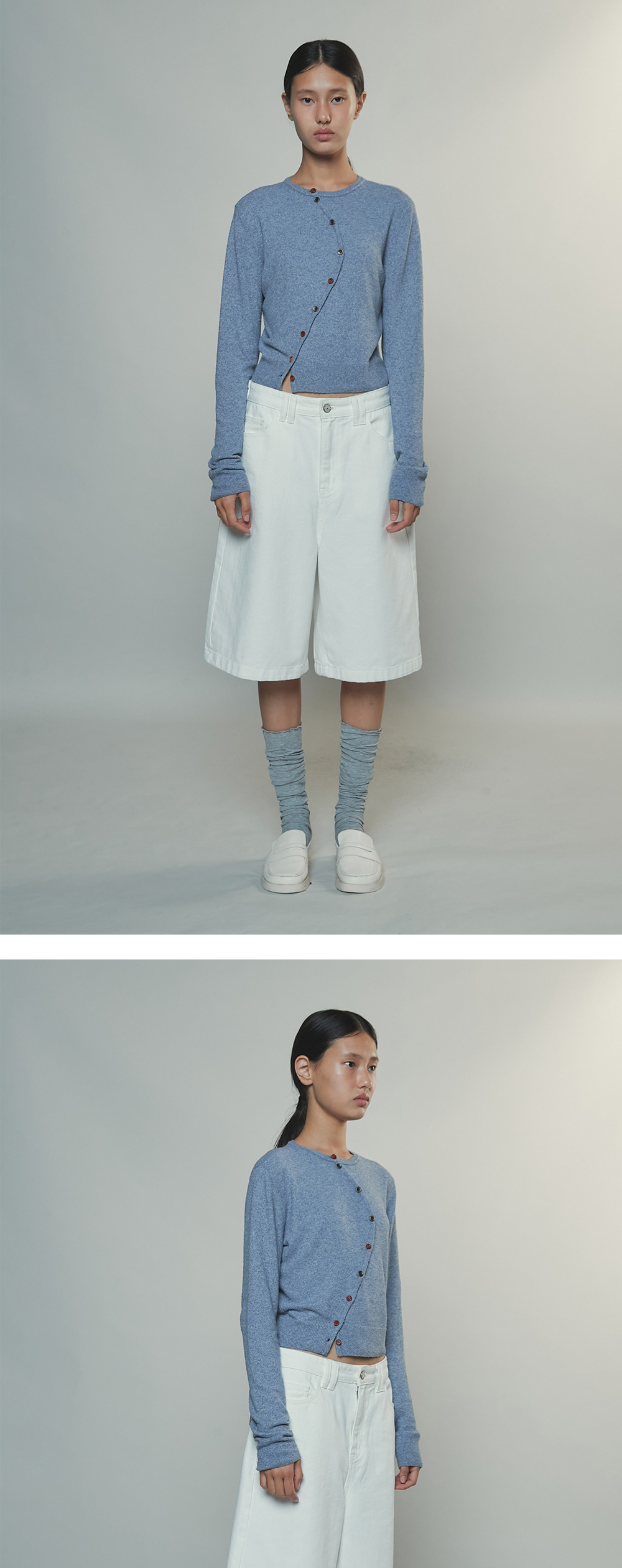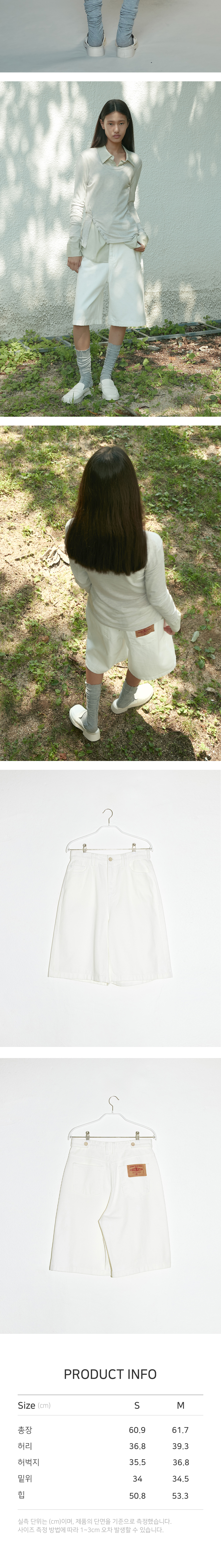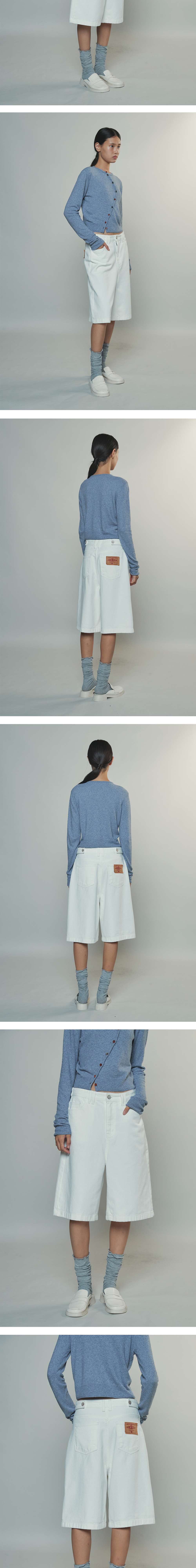 - 미디엄 기장으로 클래식하면서도 캐주얼한 무드의 버뮤다 데님 팬츠입니다. - 깨끗한 화이트 컬러로 어느 룩에도 포인트 스타일링이 가능합니다. - 자연스러운 A라인 형태로 더욱 슬림한 실루엣을 연출합니다. - 포켓의 그린 바텍과 뒷 포켓의 택션지와 허리비조로 포인트를 주었습니다.