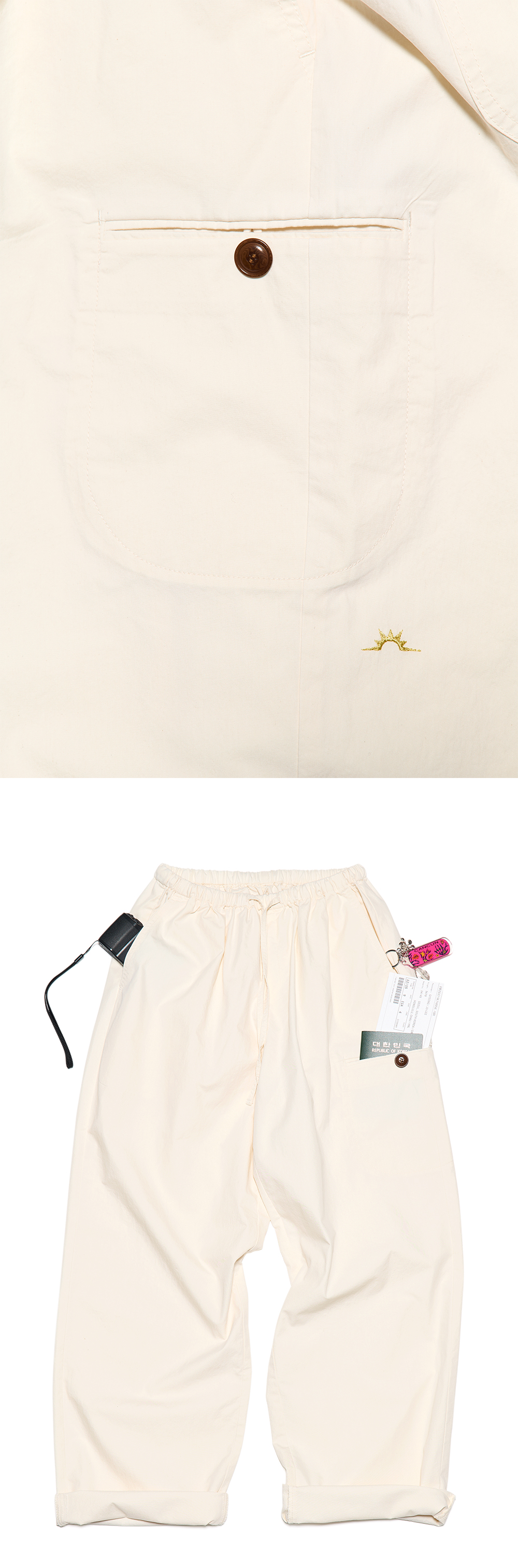 5개의 포켓이 있는 편안한 착용감의 레귤러 실루엣의 트래블 팬츠입니다. - 워싱 가공으로 빈티지한 무드 - 총 5개의 포켓 디테일 - 허리 밴딩 및 제원단 스트랩으로 사이즈 조절 가능 - 내부 행거루프 부착 - 사이드 헬로선라이즈 심볼 자수