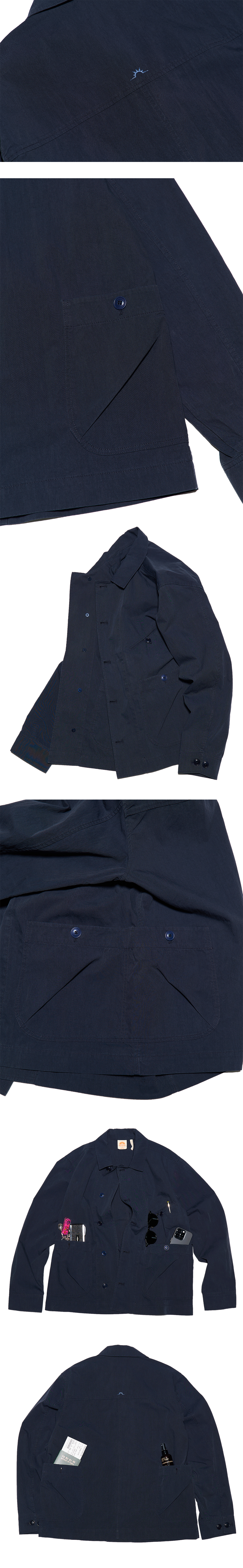 단추배색의 디테일 포인트로 여유로운 실루엣의 트래블 자켓입니다. - 워싱 가공으로 빈티지한 무드 - 여행 시 유용한 5개의 포켓 디테일 - 소매단 2개의 단추 - 내부 행거루프 부착 - 요크 하단 헬로선라이즈 심볼 자수
