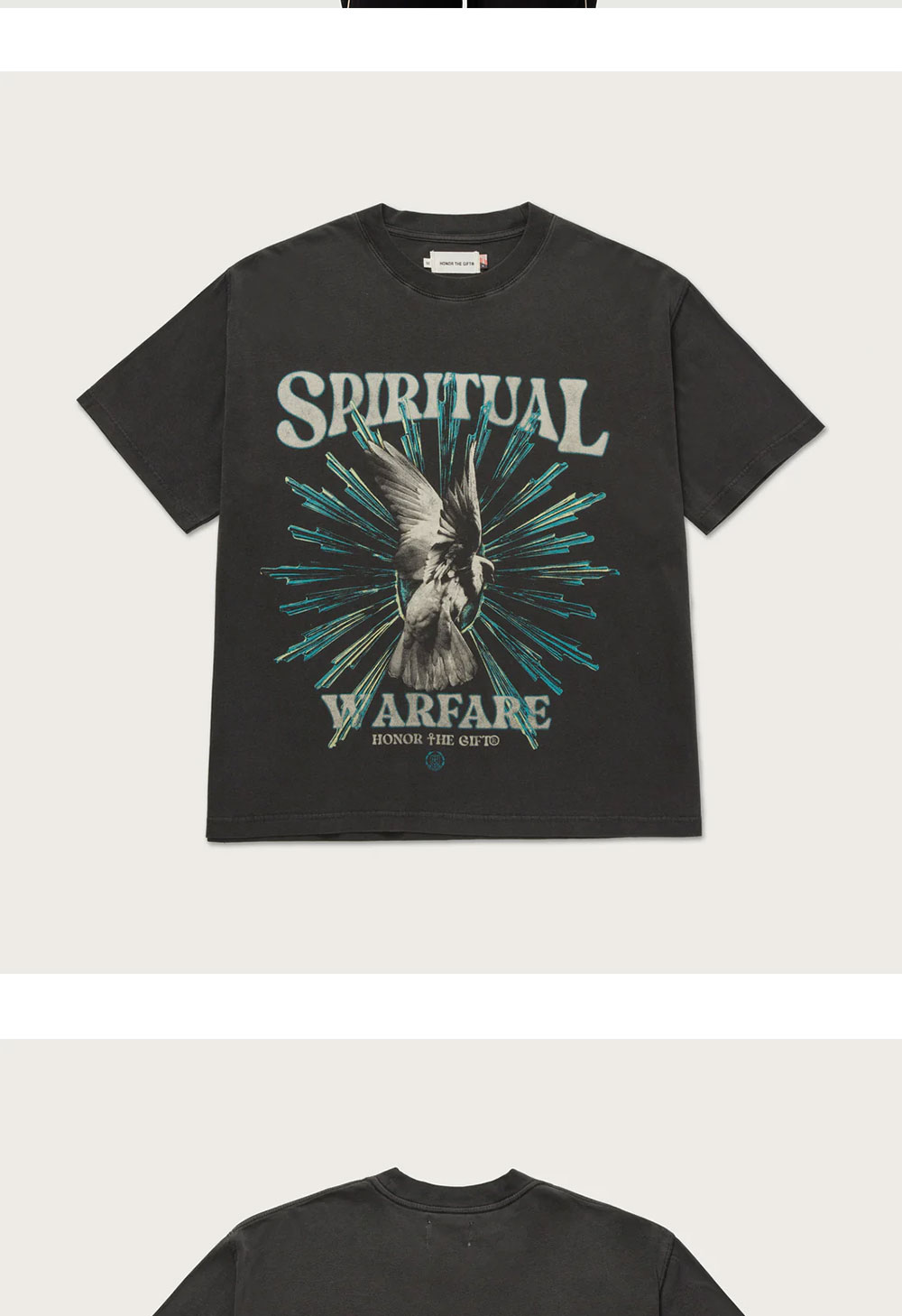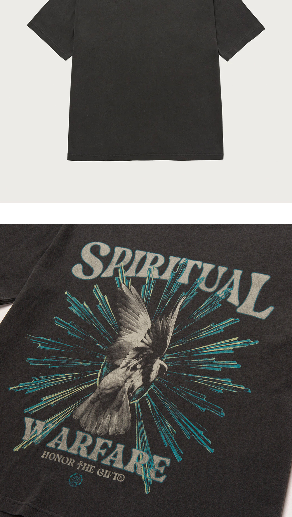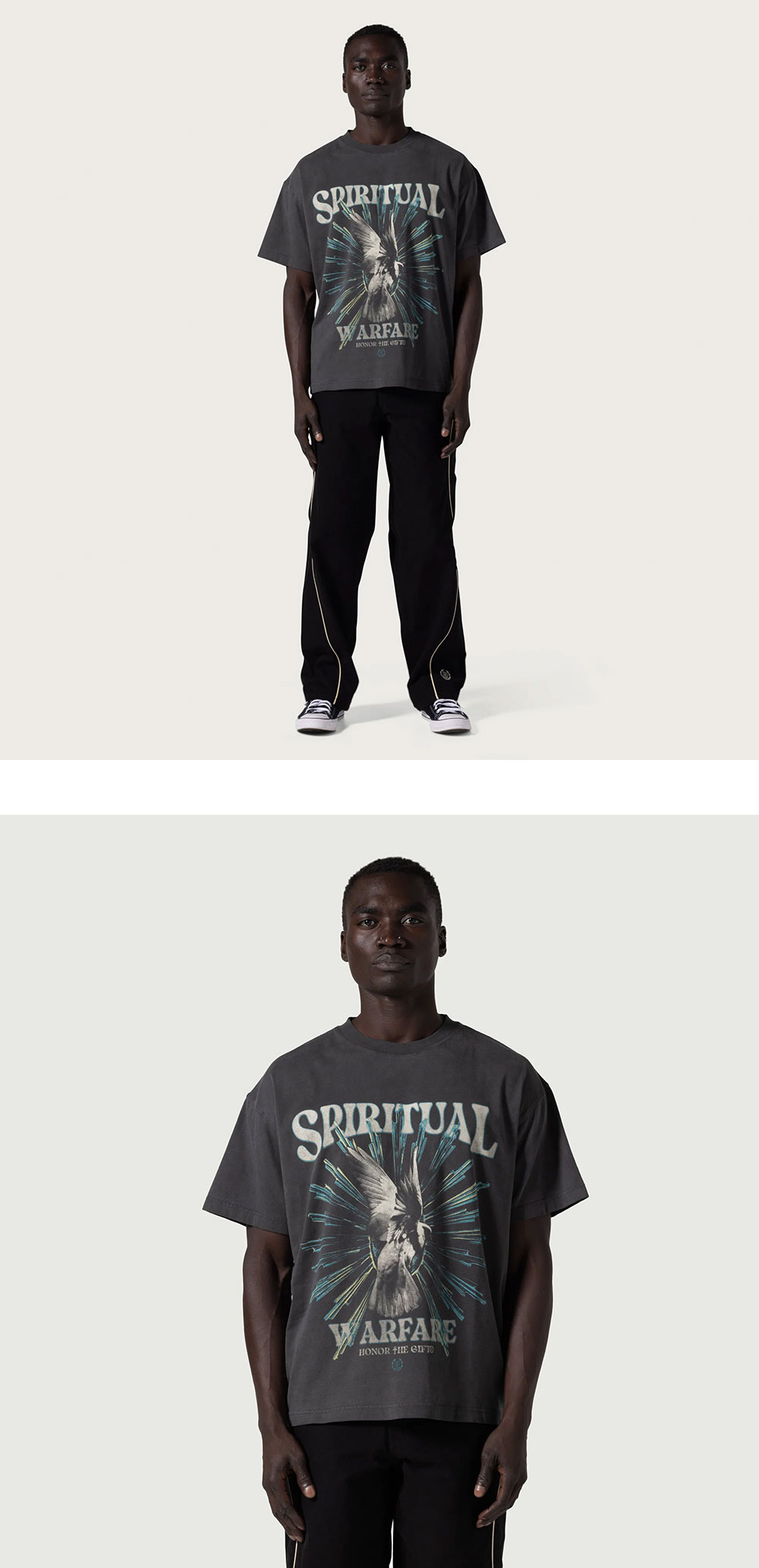 낡은 듯한 프린팅 디자인으로, 오너더기프트만의 감성이 잘 묻어나는 스피리츄얼 컨플릭트 숏슬리브 티셔츠를 소개합니다. - 페이디드 스크린 프린트 - HTG® 커스텀 라벨 - 7oz 저지 소재