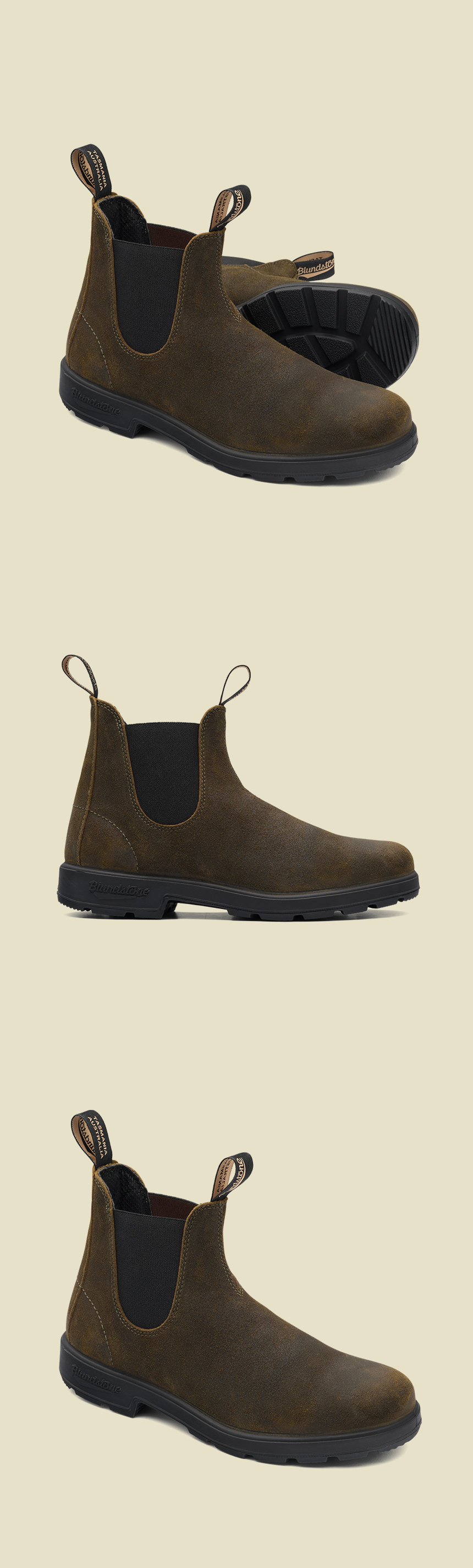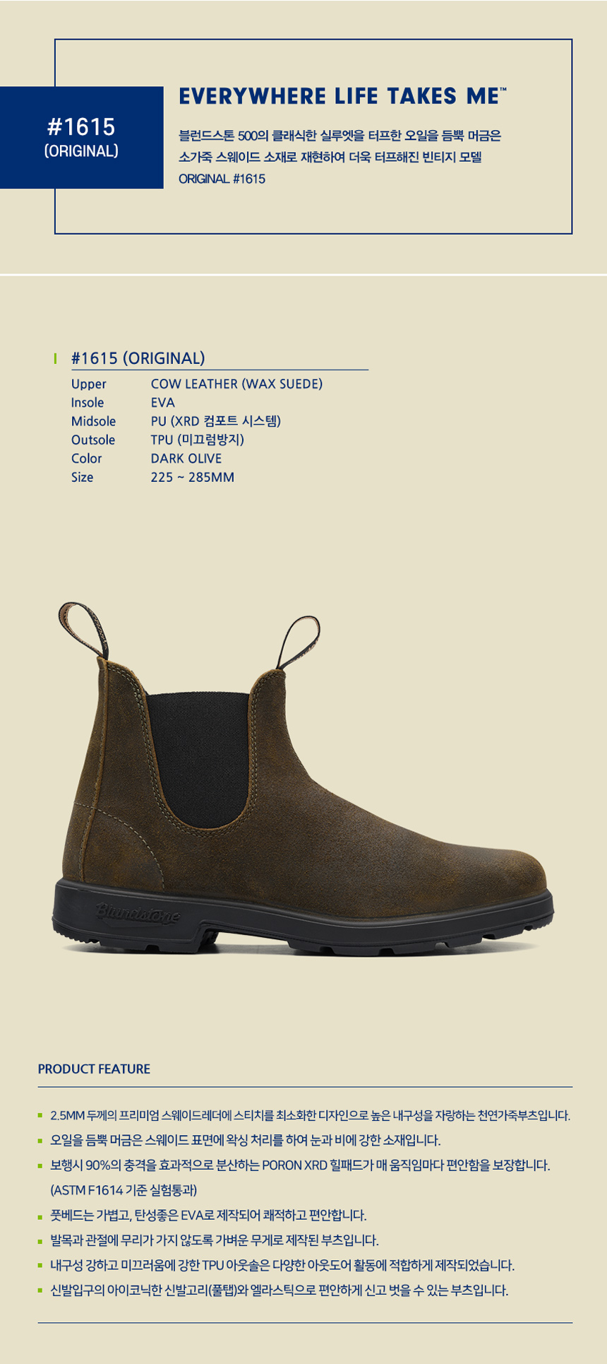 MAKING LIGHT WORK OF HARD WORK FOR 150 YEARS. 블런드스톤 부츠 하나면 충분 합니다. 1870년 부터 150년간 오직 부츠만 만들어 온 호주의 블런드스톤은 압도적인 내구성과 편안함으로 오늘날 세계에서 가장 사랑받는 첼시부츠 입니다. ORIGINAL #1615 블런드스톤 500의 클래식한 실루엣을 터프한 오일을 듬뿍 머금은 소가죽 스웨이드 소재로 재현하여 더욱 터프해진 빈티지 모델