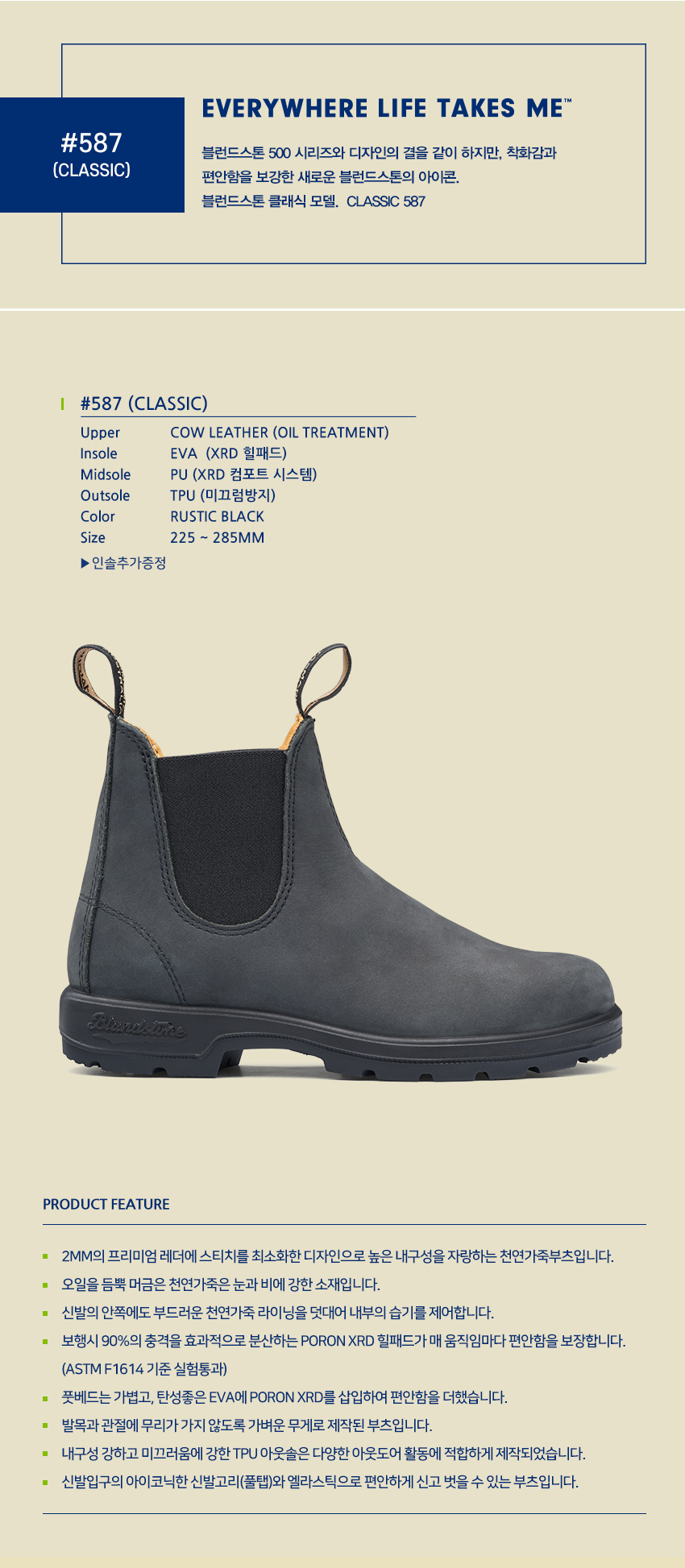 MAKING LIGHT WORK OF HARD WORK FOR 150 YEARS. 블런드스톤 부츠 하나면 충분 합니다. 1870년 부터 150년간 오직 부츠만 만들어 온 호주의 블런드스톤은 압도적인 내구성과 편안함으로 오늘날 세계에서 가장 사랑받는 첼시부츠 입니다. CLASSIC #587 블런드스톤 500 시리즈와 디자인의 결을 같이 하지만,착화감과 편안함을 보강한 새로운 블런드스톤의 아이콘. 블런드스톤 클래식 모델.