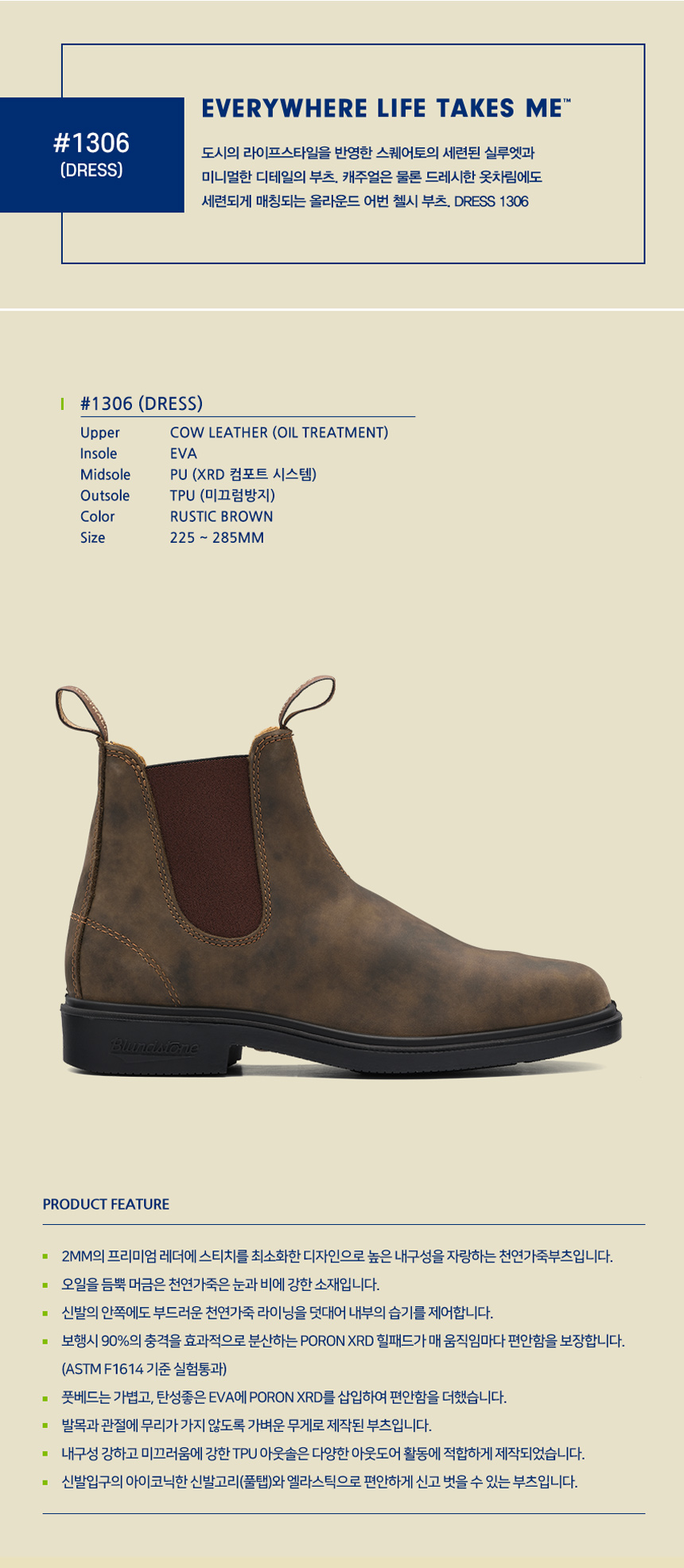 MAKING LIGHT WORK OF HARD WORK FOR 150 YEARS. 블런드스톤 부츠 하나면 충분 합니다. 1870년 부터 150년간 오직 부츠만 만들어 온 호주의 블런드스톤은 압도적인 내구성과 편안함으로 오늘날 세계에서 가장 사랑받는 첼시부츠 입니다. DRESS #1306 도시의 라이프스타일을 반영한 스퀘어토의 세련된 실루엣과 미니멀한 디테일의 부츠. 캐주얼은 물론 드레시한 옷차림에도 세련되게 매칭되는 올라운드 어번 첼시부츠.