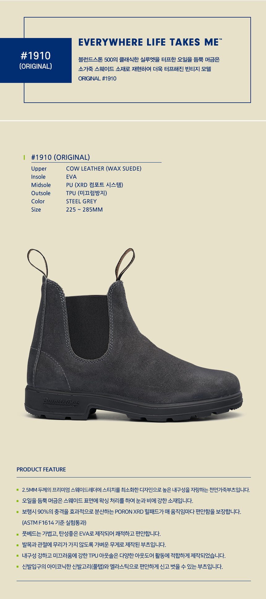 MAKING LIGHT WORK OF HARD WORK FOR 150 YEARS. 블런드스톤 부츠 하나면 충분 합니다. 1870년 부터 150년간 오직 부츠만 만들어 온 호주의 블런드스톤은 압도적인 내구성과 편안함으로 오늘날 세계에서 가장 사랑받는 첼시부츠 입니다. ORIGINAL #1910 블런드스톤 500의 클래식한 실루엣을 터프한 오일을 듬뿍 머금은 소가죽 스웨이드 소재로 재현하여 더욱 터프해진 빈티지 모델
