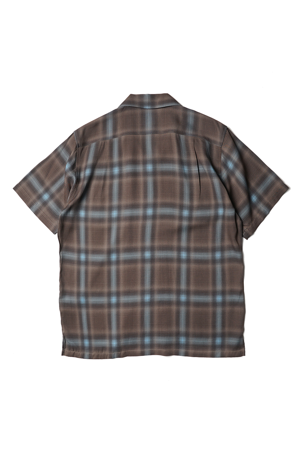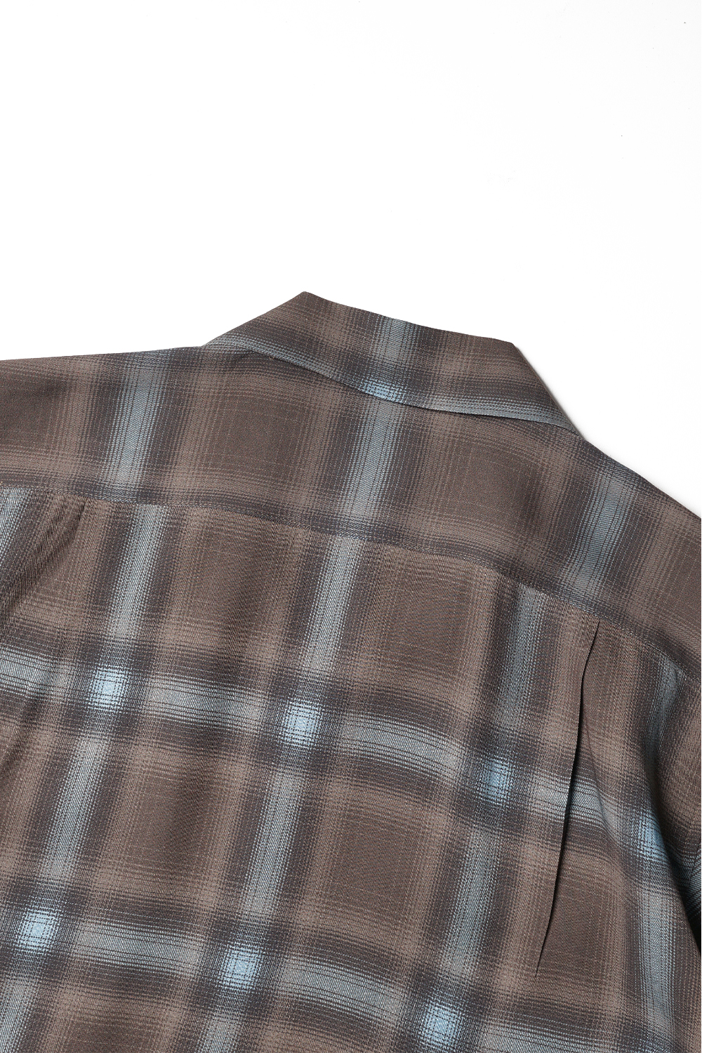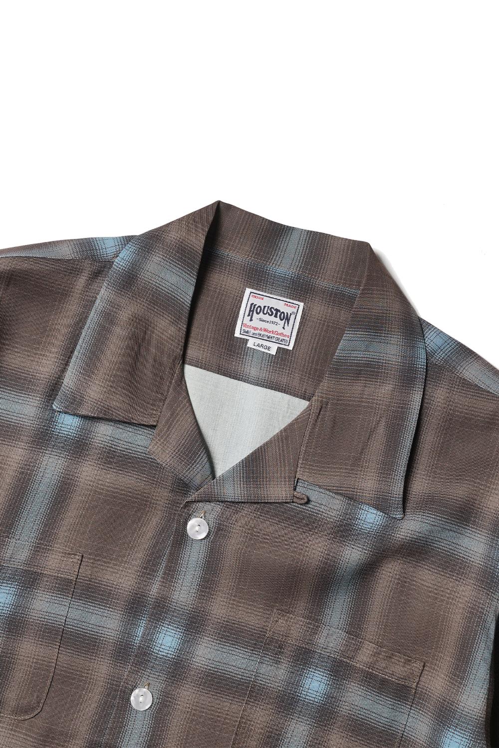 Houston Japan 40988 Ombre Check Shirt - Brown 레이온 소재의 옴브레 셔츠입니다. 레이온 특유의 부드러우며 고급스러운 소재감과 그라데이션으로 떨어지는 매력적인 컬러가 특징입니다. 오픈 카라 형태로 목 부분의 버튼을 사용하여 개폐가 가능합니다. 프론트 양측으로 포켓이 배치되어 있어서, 선글라스 등 소지품의 수납에 용이 가능합니다.