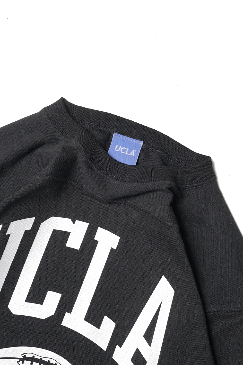 '휴스턴 재팬'에서 전개하는 '캘리포니아 대학교 로스앤젤레스 (University of California, Los Angeles)' 와의 협업 아이템입니다. 캘리포니아주 로스엔젤렌스에 위치한 'UCLA 대학교'는 1919년에 설립되었으며, 학교의 컬러는 하늘색과 금색, 그리고 마스코트는 곰인 조 브루인(Joe Bruin)입니다. 25명 이상의 노벨상 수상자를 배출하였으며, 24년 학부 순위에서 전미 공립대학교 1위, 23년 세계 대학순의 13위를 기록한 굴지의 명문 대학입니다. 230명 이상의 올림픽 메달리스트를 배출하였으며, 전미 대학 스포츠 연합에서 사상 최다인 138회 우승을 차지하였습니다. 짧은 소매가 특징인 풋볼티 입니다.