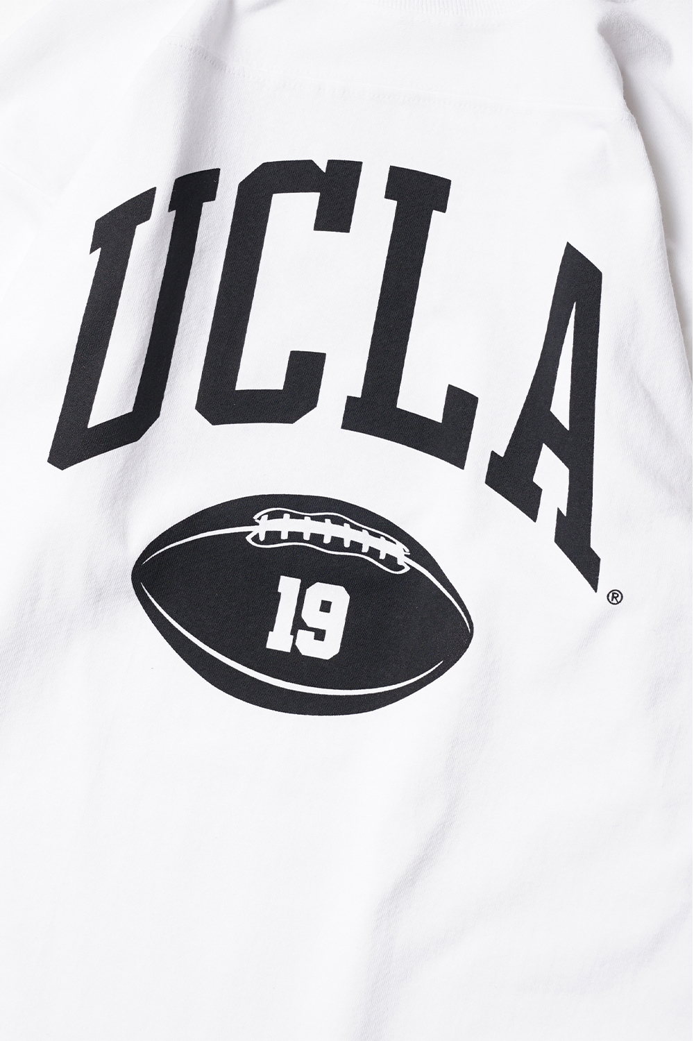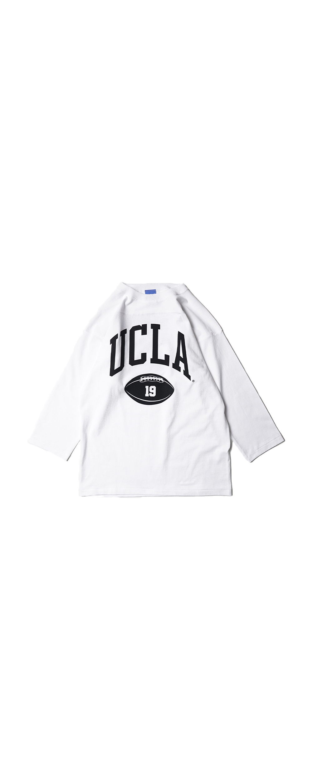 Houston Japan UCLA-0547 Football Tee (UCLA) - White '휴스턴 재팬'에서 전개하는 '캘리포니아 대학교 로스앤젤레스 (University of California, Los Angeles)' 와의 협업 아이템입니다. 캘리포니아주 로스엔젤렌스에 위치한 'UCLA 대학교'는 1919년에 설립되었으며, 학교의 컬러는 하늘색과 금색, 그리고 마스코트는 곰인 조 브루인(Joe Bruin)입니다. 25명 이상의 노벨상 수상자를 배출하였으며, 24년 학부 순위에서 전미 공립대학교 1위, 23년 세계 대학순의 13위를 기록한 굴지의 명문 대학입니다. 230명 이상의 올림픽 메달리스트를 배출하였으며, 전미 대학 스포츠 연합에서 사상 최다인 138회 우승을 차지하였습니다. 짧은 소매가 특징인 풋볼티 입니다.