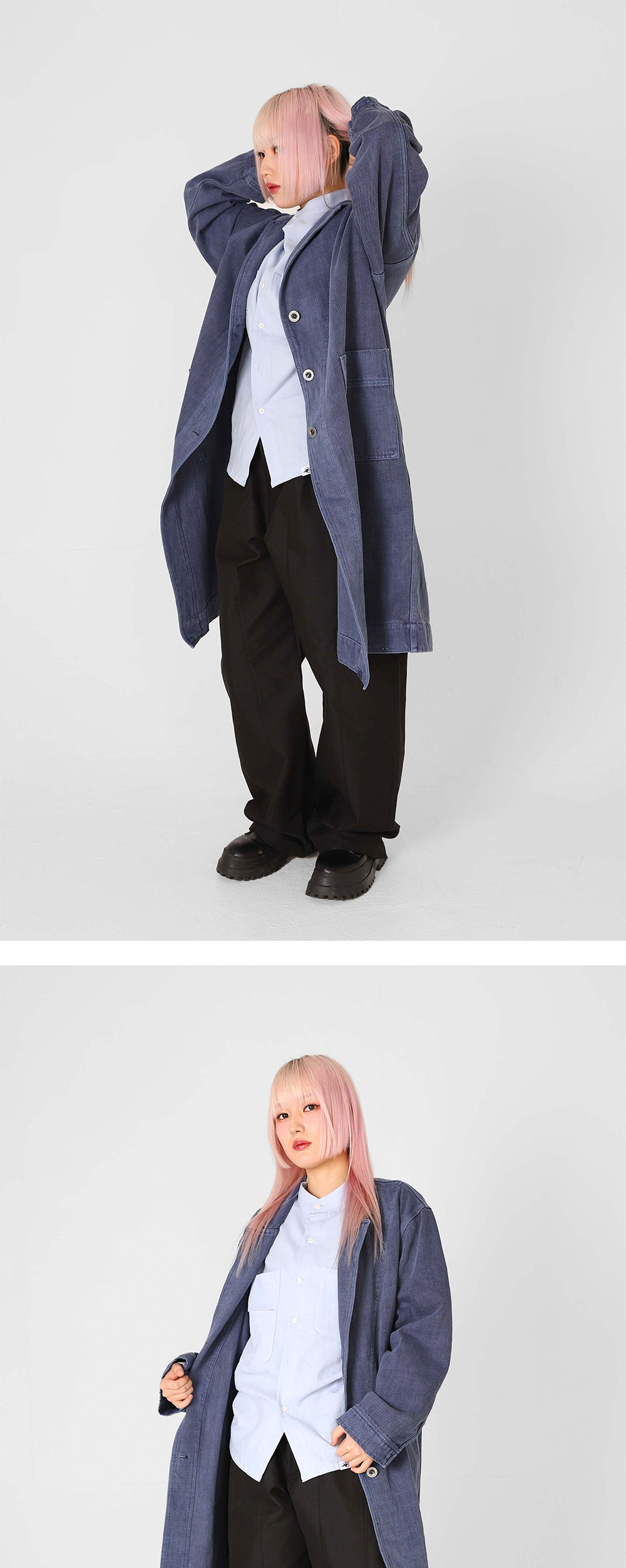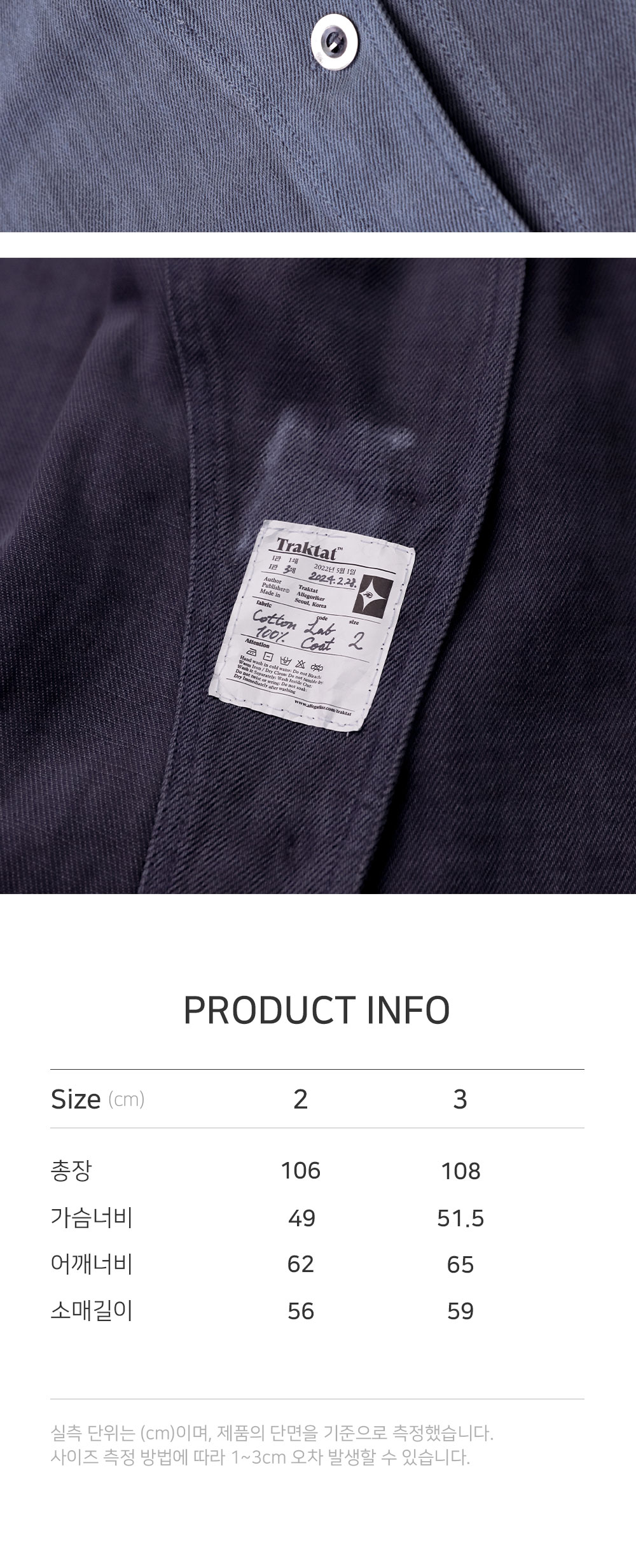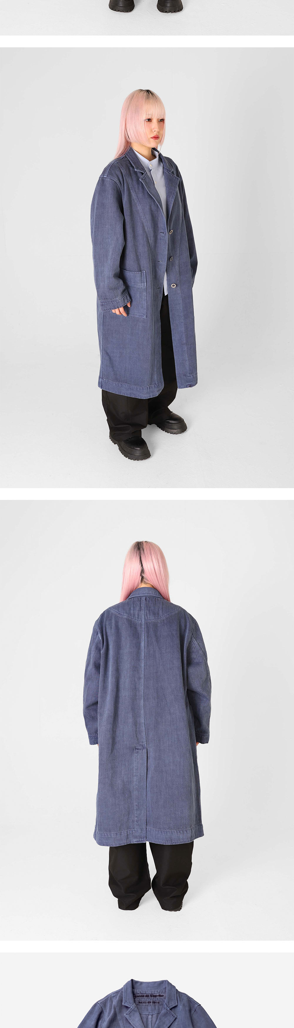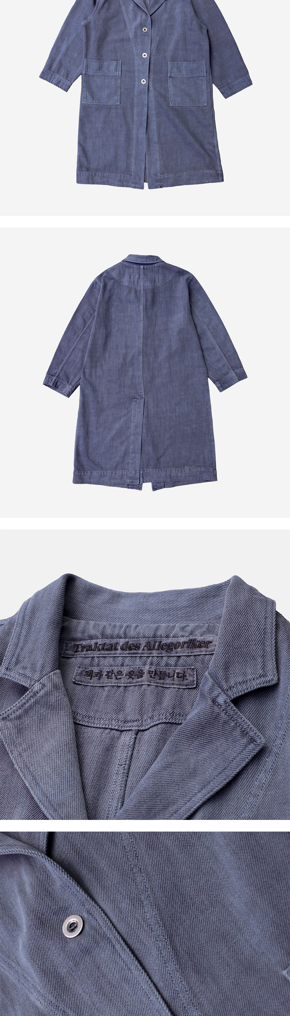 연구실에서 노동하는 이들의 의복, 실험실 코트에서 영감을 받아 제작한 코트입니다. 서부시대 먼지를 막기 위한 의복 ‘더스터 코트’의 디자인을 참고해 전면부 및 소매 안쪽에 봉제 디테일을 주었습니다. 은은한 광택이 도는 블리치드 데님 원단을 사용했고, 이후 홀 가먼트 다잉으로 깊이 있는 색감을 더했습니다. 전면부에는 데님과 잘 어울리는 밀리터리 라운드 메탈 단추를 사용하였으며, 내부에는 Ex-libris 케어라벨 및 린넨 메인라벨을 사용해 트락타트만의 감성을 표현했습니다. 오버사이즈 핏으로, 여유로운 실루엣으로 제작되었기에 터틀넥 니트나 경량 패딩 등을 입고서도 편안하게 활동할 수 있습니다. 쿵푸 팬츠 혹은 와이드한 데님 팬츠와 매치한다면 풍성하고 우아한 실루엣을 더욱 강조할 수 있습니다. - 오버사이즈 핏 - 빈티지 가먼트 다잉 - 더블 아웃 포켓 - 빈티지 밀리터리 라운드 메탈 버튼 - 트락타트 린넨 라벨 & Ex-Libris 타이벡 라벨