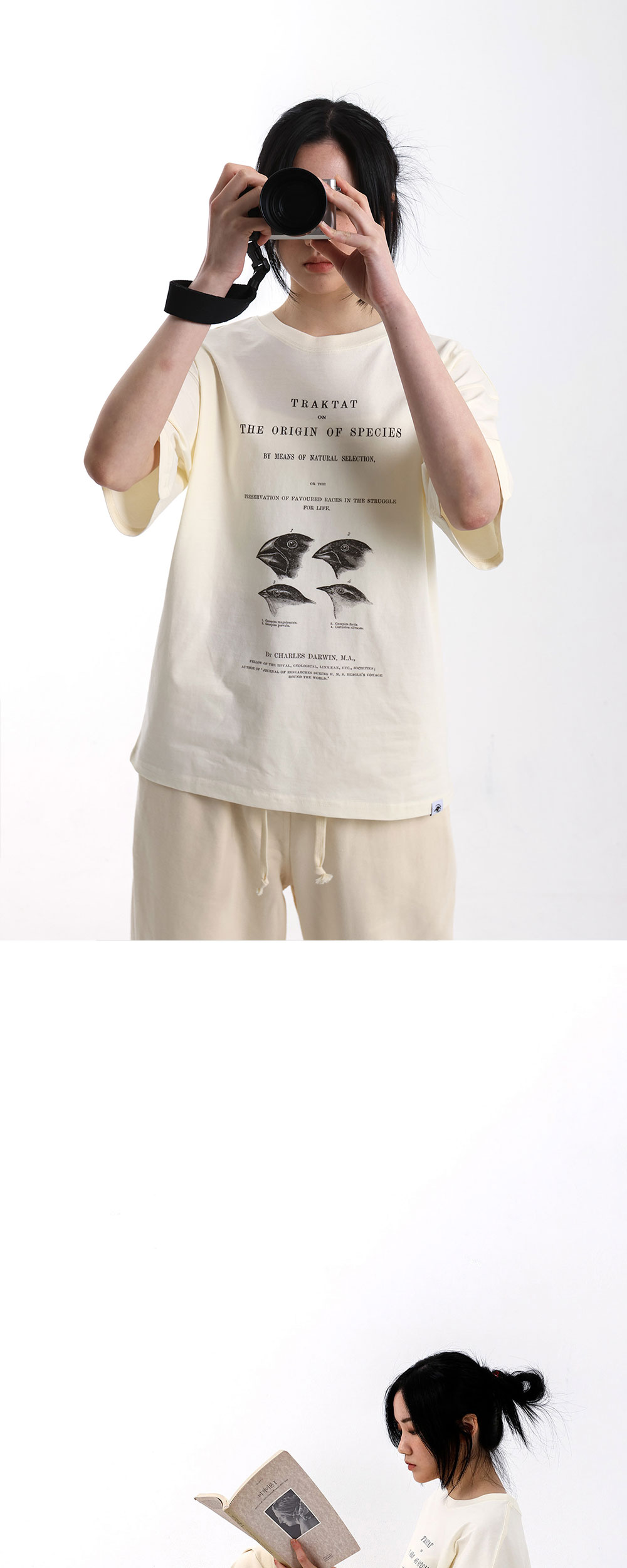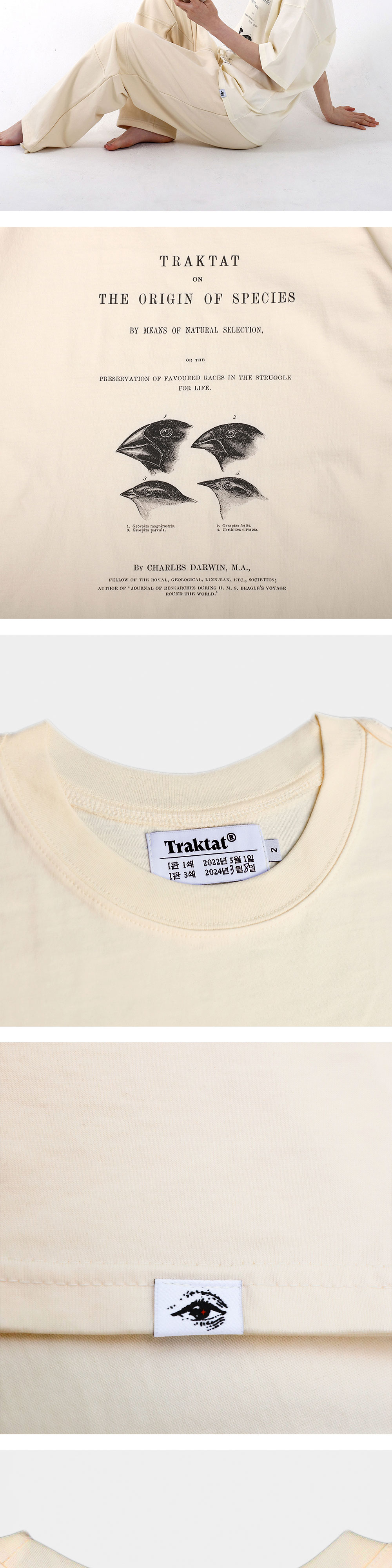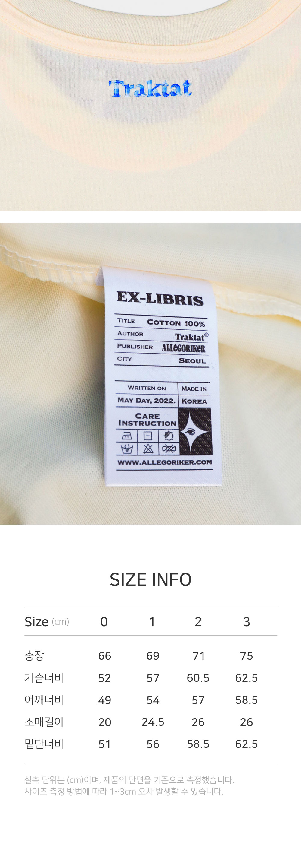 [2nd Restock] Detail - 16수 면 100% - 실켓 & 바이오 효소 가공 - 뒷판 상단 자수 디테일 : 특수 실을 사용해 개체마다 색 배합이 조금씩 다릅니다. - 아웃사이드 바인딩(Outside binding) : 트락타트만의 특징적인 봉제 방식으로 어깨 라인을 체인스티치로 마감하였습니다. - 루즈 핏/드롭 숄더 - 1판 1쇄 메인 라벨 - Ex-Libris 케어라벨